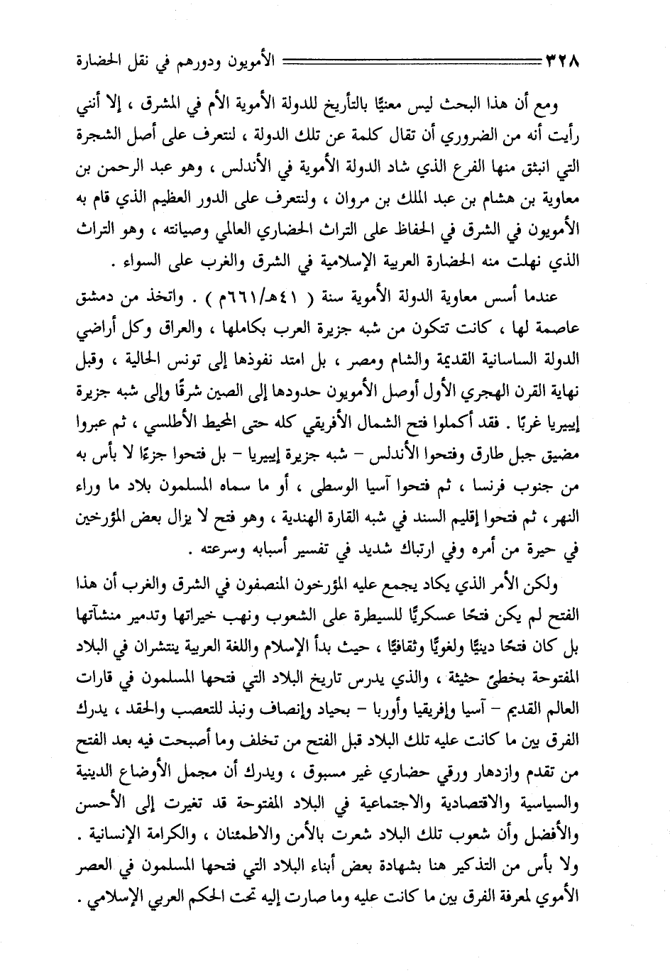 ومع أن هذا البحث ليس معنيّا بالتأريخ للدولة الأموية الأم في المشرق، إلا أنني رأيت أنه من الضروري أن تقال كلمة عن تلك الدولة، لنتعرف على أصل الشجرة التي انبثق منها الفرع الذي شاد الدولة الأموية في الأندلس، وهو عبد الرحمن بن معاوية بن هشام بن عبد الملك بن مروان، ولنتعرف على الدور العظيم الذي قام به الأمويون في الشرق في الحفاظ على التراث الحضاري العالمي وصيانته، وهو التراث الذي نهلت منه الحضارة العربية الإسلامية في الشرق والغرب على السواء.