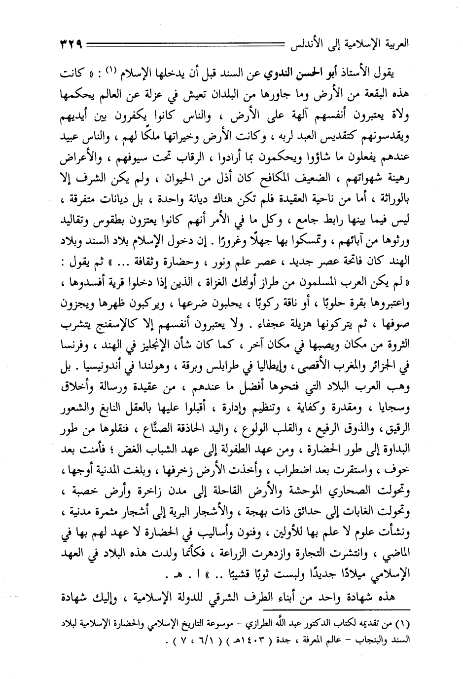 «لم يكن العرب المسلمون من طراز أولئك الغزاة، الذين إذا دخلوا قرية أفسدوها، واعتبروها بقرة حلوبا، أو ناقة ركوبا، يحلبون ضرعها، ويركبون ظهرها ويجزون صوفها، ثم يتركونها هزيلة عجفاء. ولا يعتبرون أنفسهم إلا كالإسفنج يتشرب الثروة من مكان ويصبها في مكان آخر، كما كان شأن الإنجليز في الهند، وفرنسا في الجزائر والمغرب الأقصى، وإيطاليا في طرابلس وبرقة، وهولندا في أندونيسيا. بل وهب العرب البلاد التي فتحوها أفضل ما عندهم، من عقيدة ورسالة وأخلاق وسجايا، ومقدرة وكفاية، وتنظيم وإدارة، أقبلوا عليها بالعقل النابغ والشعور الرقيق، والذوق الرفيع، والقلب الولوع، واليد الحاذقة الصنّاع، فنقلوها من طور البداوة إلى طور الحضارة، ومن عهد الطفولة إلى عهد الشباب الغض؛ فأمنت بعد خوف، واستقرت بعد اضطراب، وأخذت الأرض زخرفها، وبلغت المدنية أوجها، وتحولت الصحاري الموحشة والأرض القاحلة إلى مدن زاخرة وأرض خصبة، وتحولت الغابات إلى حدائق ذات بهجة، والأشجار البرية إلى أشجار مثمرة مدنية، ونشأت علوم لا علم بها للأولين، وفنون وأساليب في الحضارة لا عهد لهم بها في الماضي، وانتشرت التجارة وازدهرت الزراعة، فكأنما ولدت هذه البلاد في العهد الإسلامي ميلادا جديدا ولبست ثوبا قشيبا..» ا. هـ.