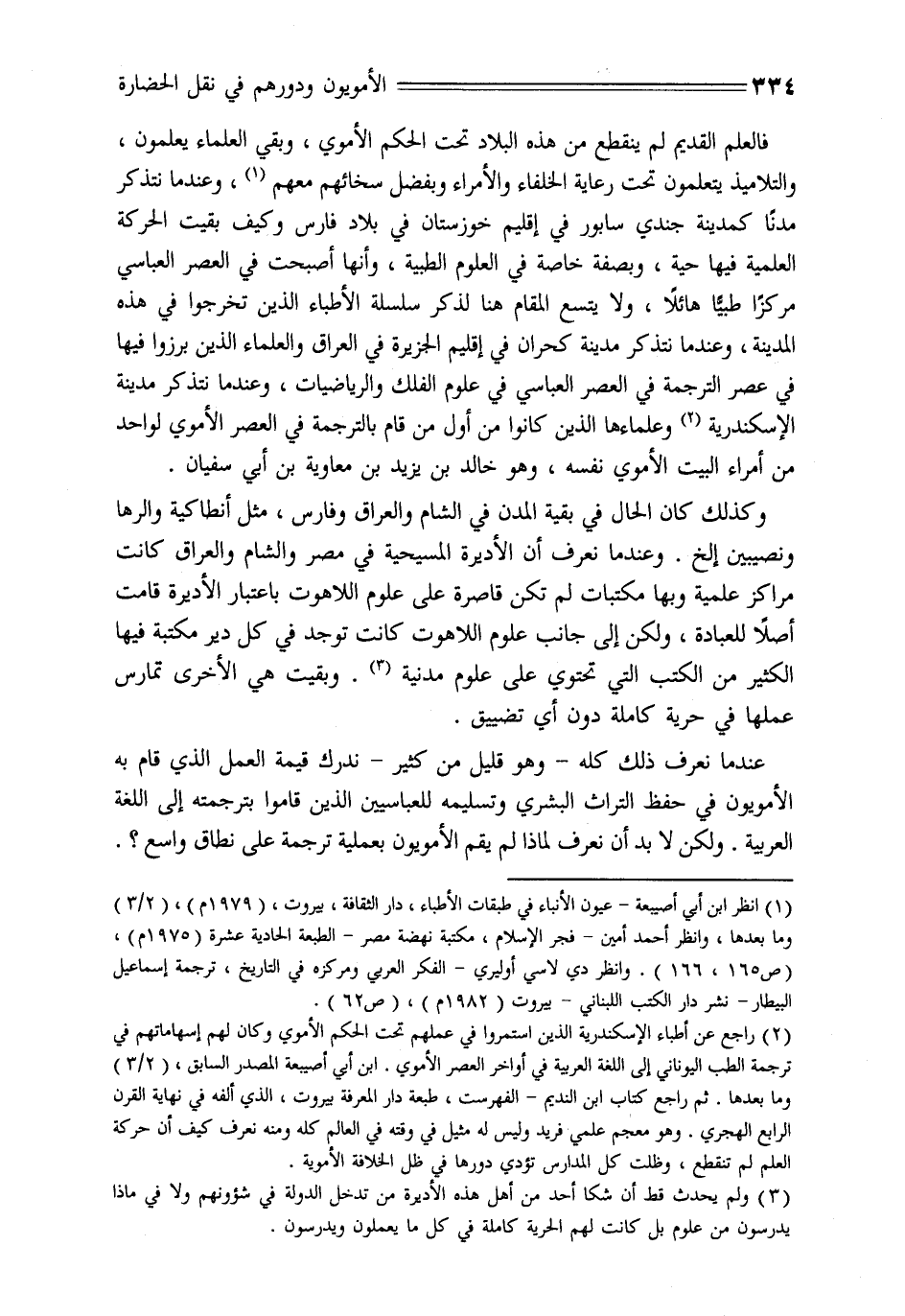(2) راجع عن أطباء الإسكندرية الذين استمروا في عملهم تحت الحكم الأموي وكان لهم إسهاماتهم في ترجمة الطب اليوناني إلى اللغة العربية في أواخر العصر الأموي. ابن أبي أصبيعة المصدر السابق، (2/ 3) وما بعدها. ثم راجع كتاب ابن النديم- الفهرست، طبعة دار المعرفة بيروت، الذي ألفه في نهاية القرن الرابع الهجري. وهو معجم علمي فريد وليس له مثيل في وقته في العالم كله ومنه نعرف كيف أن حركة العلم لم تنقطع، وظلت كل المدارس تؤدي دورها في ظل الخلافة الأموية.