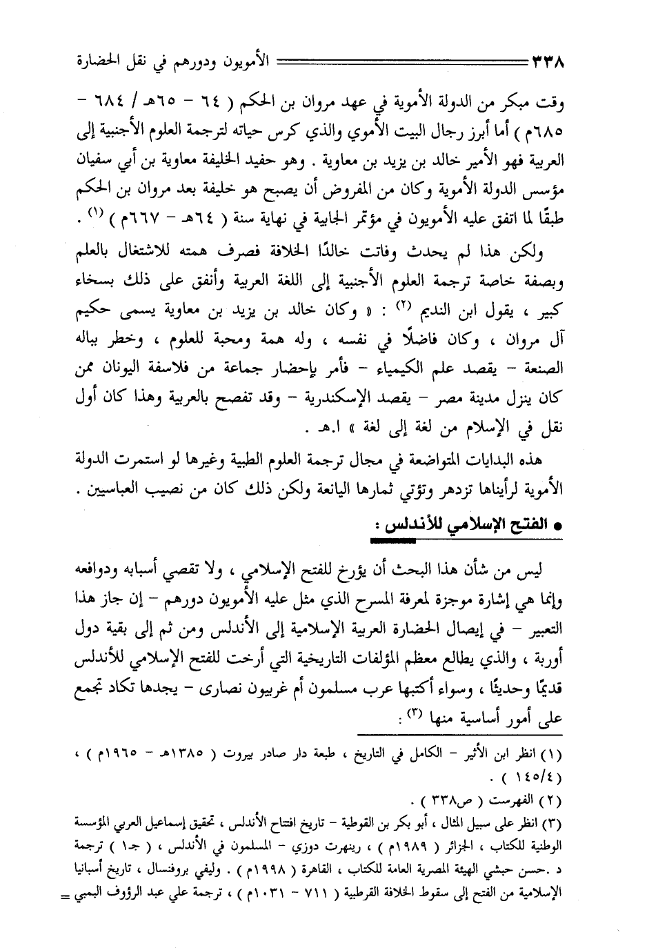 (3) انظر على سبيل المثال، أبو بكر بن القوطية- تاريخ افتتاح الأندلس، تحقيق إسماعيل العربي المؤسسة الوطنية للكتاب، الجزائر (1989 م) ، رينهرت دوزي- المسلمون في الأندلس، (ج 1) ترجمة د. حسن حبشي الهيئة المصرية العامة للكتاب، القاهرة (1998 م) . وليفي بروفنسال، تاريخ أسبانيا الإسلامية من الفتح إلى سقوط الخلافة القرطبية (711- 1031 م) ، ترجمة علي عبد الرؤوف البمبي-