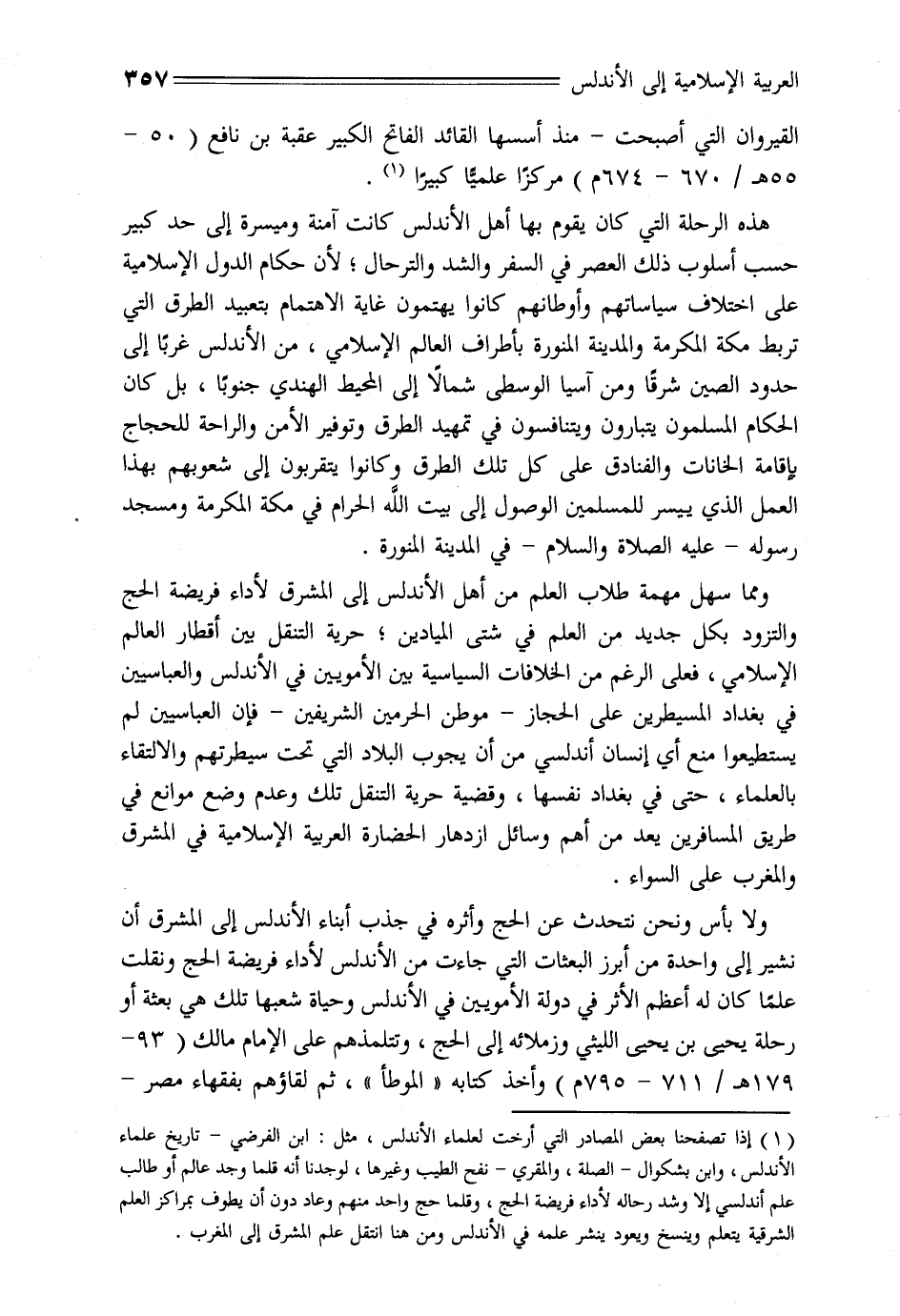 (1) إذا تصفحنا بعض المصادر التي أرخت لعلماء الأندلس، مثل: ابن الفرضي- تاريخ علماء الأندلس، وابن بشكوال- الصلة، والمقري- نفح الطيب وغيرها، لوجدنا أنه قلما وجد عالم أو طالب علم أندلسي إلا وشد رحاله لأداء فريضة الحج، وقلما حج واحد منهم وعاد دون أن يطوف بمراكز العلم الشرقية يتعلم وينسخ ويعود ينشر علمه في الأندلس ومن هنا انتقل علم المشرق إلى المغرب.