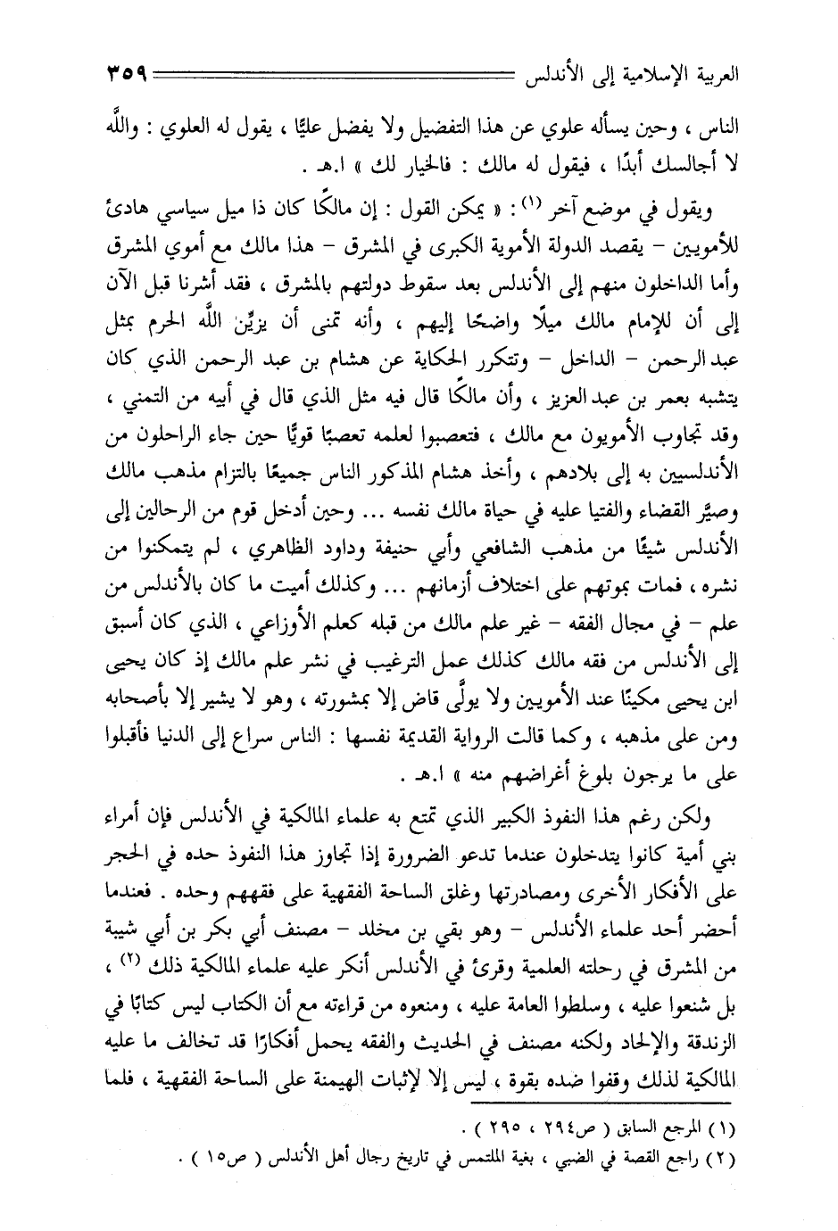 ويقول في موضع آخر «1» : «يمكن القول: إن مالكا كان ذا ميل سياسي هادئ للأمويين- يقصد الدولة الأموية الكبرى في المشرق- هذا مالك مع أموي المشرق وأما الداخلون منهم إلى الأندلس بعد سقوط دولتهم بالمشرق، فقد أشرنا قبل الآن إلى أن للإمام مالك ميلا واضحا إليهم، وأنه تمنى أن يزيّن الله الحرم بمثل عبد الرحمن- الداخل- وتتكرر الحكاية عن هشام بن عبد الرحمن الذي كان يتشبه بعمر بن عبد العزيز، وأن مالكا قال فيه مثل الذي قال في أبيه من التمني، وقد تجاوب الأمويون مع مالك، فتعصبوا لعلمه تعصبا قويّا حين جاء الراحلون من الأندلسيين به إلى بلادهم، وأخذ هشام المذكور الناس جميعا بالتزام مذهب مالك وصيّر القضاء والفتيا عليه في حياة مالك نفسه ... وحين أدخل قوم من الرحالين إلى الأندلس شيئا من مذهب الشافعي وأبي حنيفة وداود الظاهري، لم يتمكنوا من نشره، فمات بموتهم على اختلاف أزمانهم ... وكذلك أميت ما كان بالأندلس من علم- في مجال الفقه- غير علم مالك من قبله كعلم الأوزاعي، الذي كان أسبق إلى الأندلس من فقه مالك كذلك عمل الترغيب في نشر علم مالك إذ كان يحيى ابن يحيى مكينا عند الأمويين ولا يولّى قاض إلا بمشورته، وهو لا يشير إلا بأصحابه ومن على مذهبه، وكما قالت الرواية القديمة نفسها: الناس سراع إلى الدنيا فأقبلوا على ما يرجون بلوغ أغراضهم منه» ا. هـ.