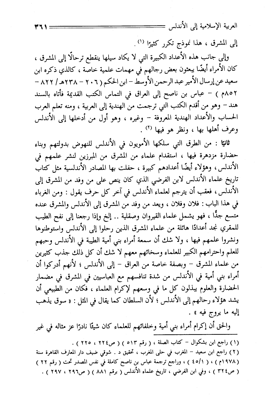 وإلى جانب هذه الأعداد الكبيرة التي لا يكاد سيلها ينقطع ترحالا إلى المشرق، كان الأمراء أيضا يبعثون بعض رجالهم في مهمات علمية خاصة، كالذي ذكره ابن سعيد عن إرسال الأمير عبد الرحمن الأوسط- ابن الحكم (206- 238 هـ/ 822- 852 م) - عباس بن ناصح إلى العراق في التماس الكتب القديمة فأتاه بالسند هند- وهو من أقدم الكتب التي ترجمت من الهندية إلى العربية، ومنه تعلم العرب الحساب والأعداد الهندية المعروفة- وغيره، وهو أول من أدخلها إلى الأندلس وعرف أهلها بها، ونظر هو فيها «2» .
