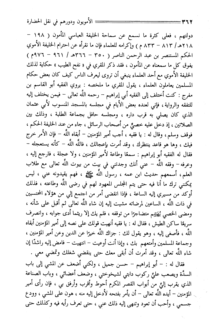 دولتهم، فعلى كثرة ما نسمع عن سماحة الخليفة العباسي المأمون (198- 218 هـ/ 813- 833 م) وإكرامه للعلماء فإن ما نقرأه عن احترام الخليفة الأموي الحكم المستنصر بن عبد الرحمن الناصر (350- 366 هـ/ 961- 976 م) يفوق كل ما سمعناه عن المأمون، فقد ذكر المقري في «نفح الطيب» حكاية لذلك الخليفة الأموي مع أحد العلماء ينبغي أن تروى ليعرف الناس كيف كان بعض حكام المسلمين يعاملون العلماء، يقول المقري ما ملخصه: يروي الفقيه أبو القاسم بن مفرج: كنت أختلف إلى الفقيه أبي إبراهيم- رحمه الله تعالى- فيمن يختلف إليه للتفقه والرواية، فإني لعنده بعض الأيام في مجلسه بالمسجد المنسوب لأبي عثمان الذي كان يصلي به قرب داره، ومجلسه حافل بجماعة الطلبة، وذلك بين الصلاتين، إذ دخل عليه خصيّ من أصحاب الرسائل، جاء من عند الخليفة الحكم، فوقف وسلم، وقال له: يا فقيه، أجب أمير المؤمنين- أبقاه الله- فإن الأمر خرج فيك، وها هو قاعد ينتظرك، وقد أمرت بإعجالك، فالله الله- كأنه يستعجله- فقال له الفقيه أبو إبراهيم: سمعا وطاعة لأمير المؤمنين، ولا عجلة، فارجع إليه، وعرفه- وفقه الله- عني أنك وجدتني في بيت من بيوت الله تعالى مع طلاب العلم، أسمعهم حديث ابن عمه، رسول الله صلّى الله عليه وسلم، فهم يقيدونه عني، ليس يمكنني ترك ما أنا فيه حتى يتم المجلس المعهود لهم في رضى الله وطاعته، فذلك أوكد من مسيري إليه الساعة، فإذا انقضى أمر من اجتمع إلي من هؤلاء المحتسبين في ذات الله، الساعين لمرضاته مشيت إليه إن شاء الله تعالى ثم أقبل على شأنه، ومضى الخصي يهينم متضاجرا من توقفه، فلم يك إلا ريثما أدى جوابه، وانصرف سريعا ساكن الطيش، فقال له: يا فقيه أنهيت قولك على نصه إلى أمير المؤمنين أبقاه الله، فأصغى إليه، وهو يقول لك: جزاك الله خيرا عن الدين وعن أمير المؤمنين، وجماعة المسلمين وأمتعهم بك، وإذا أنت أوعيت- انتهيت- فامض إليه راشدا إن شاء الله تعالى، وقد أمرت أن أبقى معك حتى ينقضي شغلك وتمضي معي.