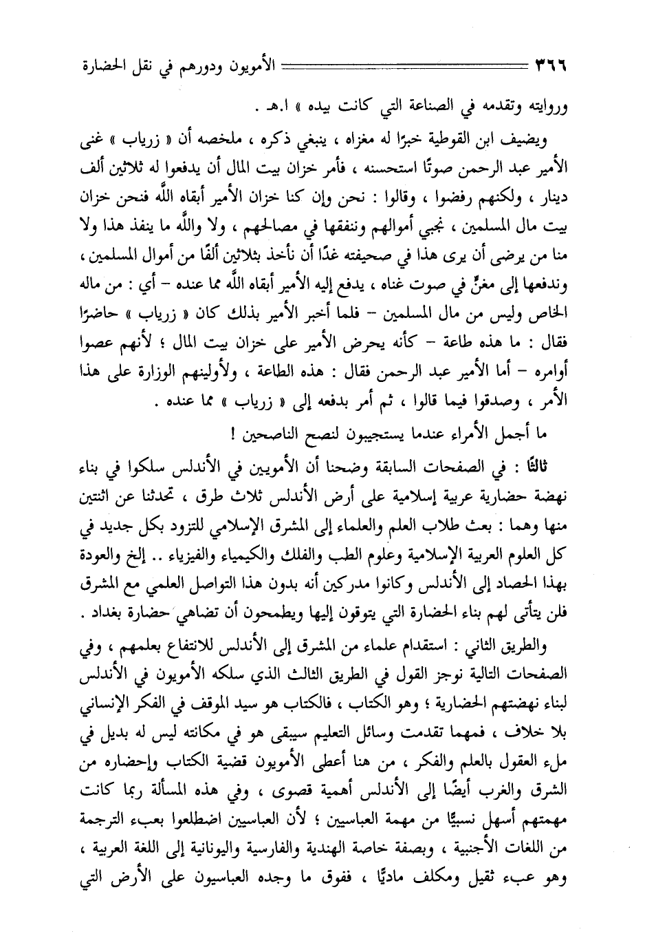 والطريق الثاني: استقدام علماء من المشرق إلى الأندلس للانتفاع بعلمهم، وفي الصفحات التالية نوجز القول في الطريق الثالث الذي سلكه الأمويون في الأندلس لبناء نهضتهم الحضارية؛ وهو الكتاب، فالكتاب هو سيد الموقف في الفكر الإنساني بلا خلاف، فمهما تقدمت وسائل التعليم سيبقى هو في مكانته ليس له بديل في ملء العقول بالعلم والفكر، من هنا أعطى الأمويون قضية الكتاب وإحضاره من الشرق والغرب أيضا إلى الأندلس أهمية قصوى، وفي هذه المسألة ربما كانت مهمتهم أسهل نسبيّا من مهمة العباسيين؛ لأن العباسيين اضطلعوا بعبء الترجمة من اللغات الأجنبية، وبصفة خاصة الهندية والفارسية واليونانية إلى اللغة العربية، وهو عبء ثقيل ومكلف ماديّا، ففوق ما وجده العباسيون على الأرض التي