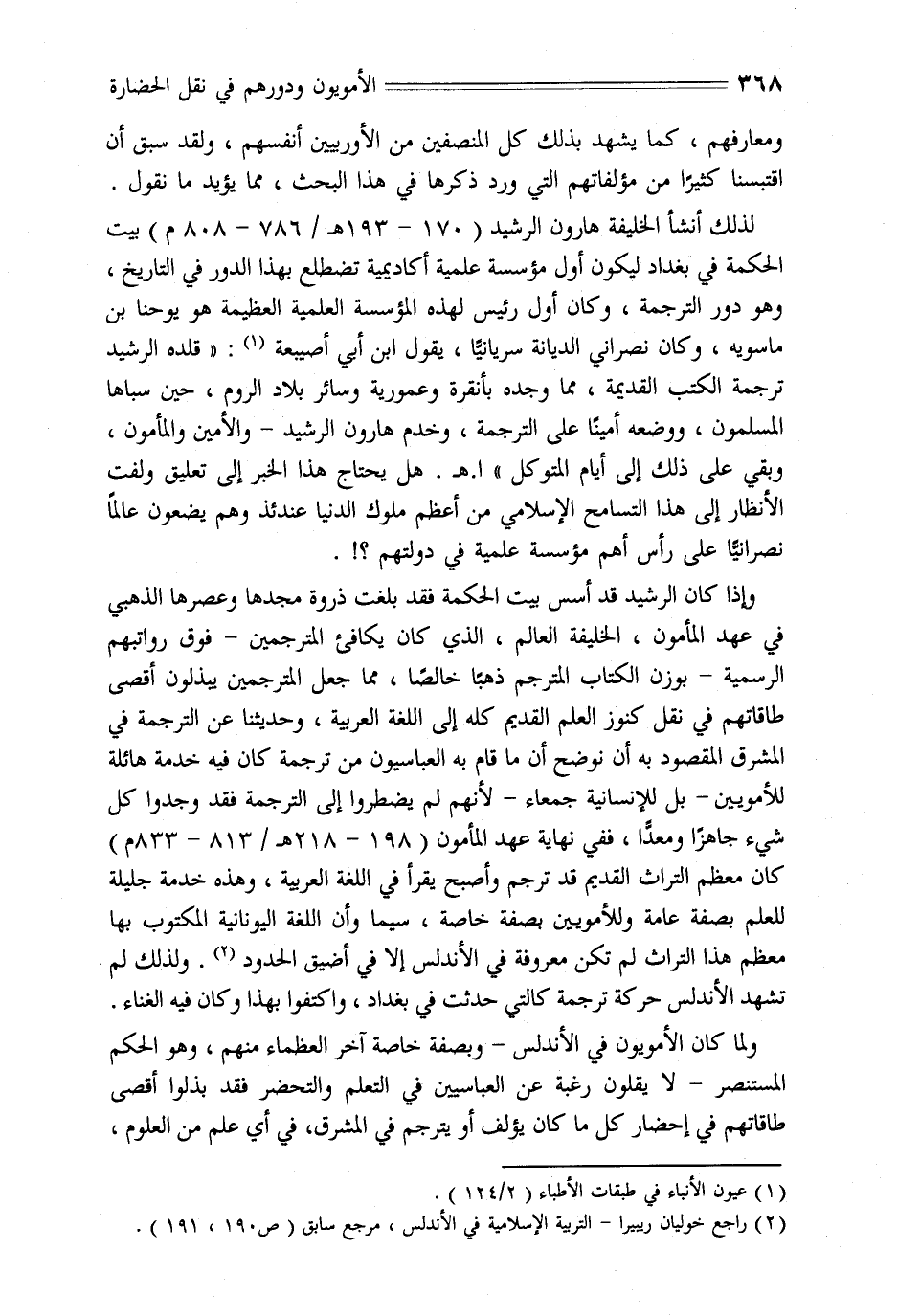 لذلك أنشأ الخليفة هارون الرشيد (170- 193 هـ/ 786- 808 م) بيت الحكمة في بغداد ليكون أول مؤسسة علمية أكاديمية تضطلع بهذا الدور في التاريخ، وهو دور الترجمة، وكان أول رئيس لهذه المؤسسة العلمية العظيمة هو يوحنا بن ماسويه، وكان نصراني الديانة سريانيّا، يقول ابن أبي أصيبعة «1» : «قلده الرشيد ترجمة الكتب القديمة، مما وجده بأنقرة وعمورية وسائر بلاد الروم، حين سباها المسلمون، ووضعه أمينا على الترجمة، وخدم هارون الرشيد- والأمين والمأمون، وبقي على ذلك إلى أيام المتوكل» ا. هـ. هل يحتاج هذا الخبر إلى تعليق ولفت الأنظار إلى هذا التسامح الإسلامي من أعظم ملوك الدنيا عندئذ وهم يضعون عالما نصرانيّا على رأس أهم مؤسسة علمية في دولتهم؟!.