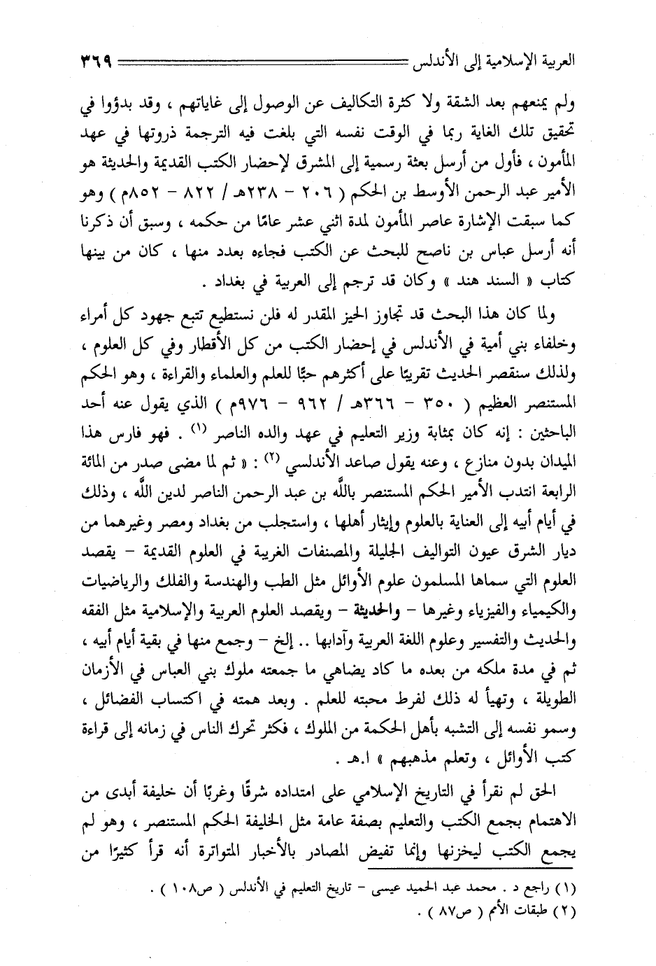 ولم يمنعهم بعد الشقة ولا كثرة التكاليف عن الوصول إلى غاياتهم، وقد بدؤوا في تحقيق تلك الغاية ربما في الوقت نفسه التي بلغت فيه الترجمة ذروتها في عهد المأمون، فأول من أرسل بعثة رسمية إلى المشرق لإحضار الكتب القديمة والحديثة هو الأمير عبد الرحمن الأوسط بن الحكم (206- 238 هـ/ 822- 852 م) وهو كما سبقت الإشارة عاصر المأمون لمدة اثني عشر عاما من حكمه، وسبق أن ذكرنا أنه أرسل عباس بن ناصح للبحث عن الكتب فجاءه بعدد منها، كان من بينها كتاب «السند هند» وكان قد ترجم إلى العربية في بغداد.