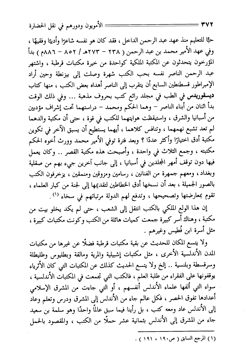 حبّا للتعليم منذ عهد عبد الرحمن الداخل، فقد كان هو نفسه شاعرا وأديبا وفقيها، وفي عهد الأمير محمد بن عبد الرحمن (238- 273 هـ/ 852- 886 م) بدأ المؤرخون يتحدثون عن المكتبة الملكية كواحدة من خيرة مكتبات قرطبة، واشتهر عبد الرحمن الناصر نفسه بحب الكتب شهرة وصلت إلى بيزنطة وحين أراد الإمبراطور قسطنطين السابع أن يتقرب إلى الناصر أهداه بعض الكتب، منها كتاب ديسقوريدس في الطب في مجلد رائع كتب بحروف مذهبة ... وفي ذلك الوقت بدأ اثنان من أبناء الناصر- وهما الحكم ومحمد- دراستهما تحت إشراف مؤدبين من أسبانيا والشرق، واستيقظت هوايتهما للكتب في قوة، حتى أن مكتبة والدهما لم تعد تشبع نهمهما، وتنافس كلاهما، أيهما يستطيع أن يسبق الآخر في تكوين مكتبة أدق اختيارا وأكثر عددا؟ وبعد فترة توفي الأمير محمد وورث أخوه الحكم مكتبته، وجمع الثلاث في واحدة، وأصبحت هذه مكتبة القصر ... وكان يعمل فيها دون توقف أمهر المجلدين في أسبانيا، إلى جانب آخرين جيء بهم من صقلية وبغداد، ومعهم جمهرة من الفنانين، رسامين ومزوقين ومنمقين، يزخرفون الكتب بالصور الجميلة، بعد أن نسخها أدق الخطاطين لتقديمها إلى لجنة من كبار العلماء، تقوم بمعارضتها وتصحيحها، وتدفع لهم الدولة مرتباتهم في سخاء «1» .