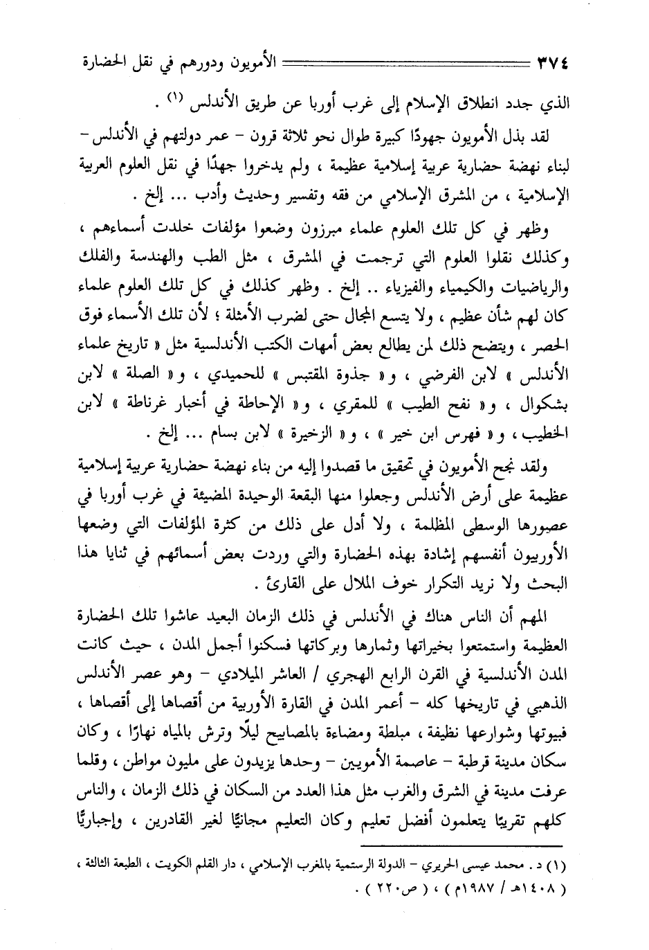 لقد بذل الأمويون جهودا كبيرة طوال نحو ثلاثة قرون- عمر دولتهم في الأندلس- لبناء نهضة حضارية عربية إسلامية عظيمة، ولم يدخروا جهدا في نقل العلوم العربية الإسلامية، من المشرق الإسلامي من فقه وتفسير وحديث وأدب ... إلخ.