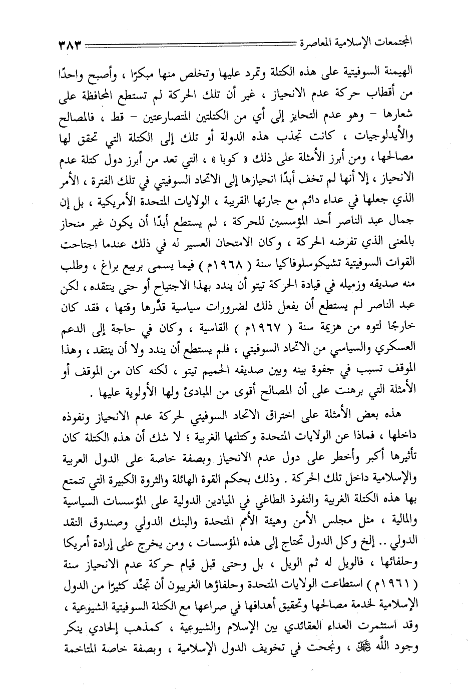 الهيمنة السوفيتية على هذه الكتلة وتمرد عليها وتخلص منها مبكرا، وأصبح واحدا من أقطاب حركة عدم الانحياز، غير أن تلك الحركة لم تستطع المحافظة على شعارها- وهو عدم التحايز إلى أي من الكتلتين المتصارعتين- قط، فالمصالح والأيدلوجيات، كانت تجذب هذه الدولة أو تلك إلى الكتلة التي تحقق لها مصالحها، ومن أبرز الأمثلة على ذلك «كوبا» ، التي تعد من أبرز دول كتلة عدم الانحياز، إلا أنها لم تخف أبدا انحيازها إلى الاتحاد السوفيتي في تلك الفترة، الأمر الذي جعلها في عداء دائم مع جارتها القريبة، الولايات المتحدة الأمريكية، بل إن جمال عبد الناصر أحد المؤسسين للحركة، لم يستطع أبدا أن يكون غير منحاز بالمعنى الذي تفرضه الحركة، وكان الامتحان العسير له في ذلك عند ما اجتاحت القوات السوفيتية تشيكوسلوفاكيا سنة (1968 م) فيما يسمى بربيع براغ، وطلب منه صديقه وزميله في قيادة الحركة تيتو أن يندد بهذا الاجتياح أو حتى ينتقده، لكن عبد الناصر لم يستطع أن يفعل ذلك لضرورات سياسية قدّرها وقتها، فقد كان خارجا لتوه من هزيمة سنة (1967 م) القاسية، وكان في حاجة إلى الدعم العسكري والسياسي من الاتحاد السوفيتي، فلم يستطع أن يندد ولا أن ينتقد، وهذا الموقف تسبب في جفوة بينه وبين صديقه الحميم تيتو، لكنه كان من الموقف أو الأمثلة التي برهنت على أن المصالح أقوى من المبادئ ولها الأولوية عليها.