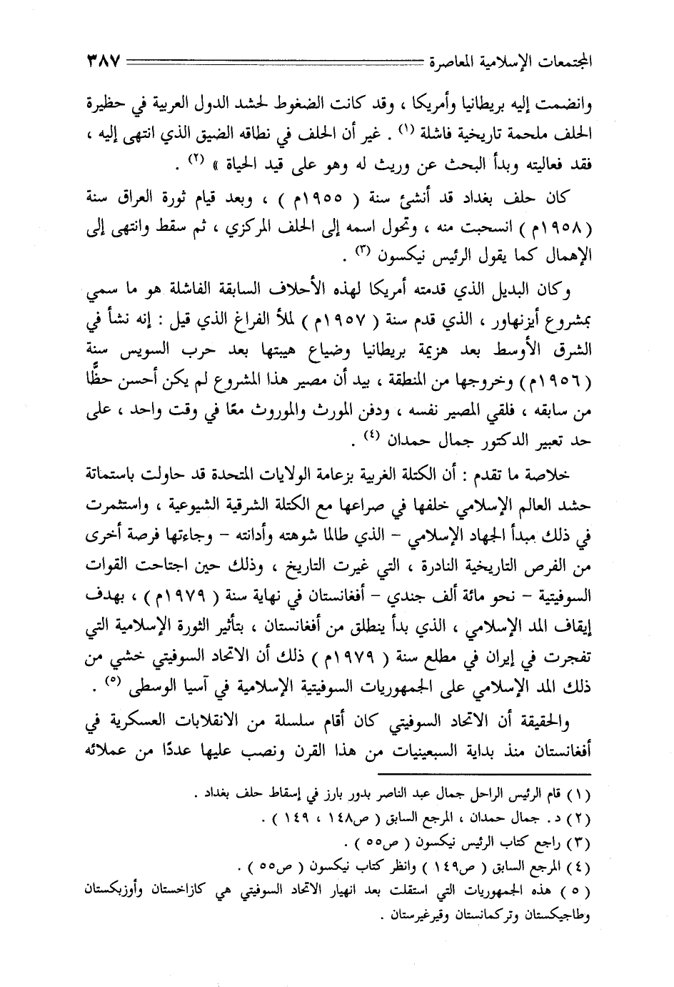 خلاصة ما تقدم: أن الكتلة الغربية بزعامة الولايات المتحدة قد حاولت باستماتة حشد العالم الإسلامي خلفها في صراعها مع الكتلة الشرقية الشيوعية، واستثمرات في ذلك مبدأ الجهاد الإسلامي- الذي طالما شوهته وأدانته- وجاءتها فرصة أخرى من الفرص التاريخية النادرة، التي غيرت التاريخ، وذلك حين اجتاحت القوات السوفيتية- نحو مائة ألف جندي- أفغانستان في نهاية سنة (1979 م) ، بهدف إيقاف المد الإسلامي، الذي بدأ ينطلق من أفغانستان، بتأثير الثورة الإسلامية التي تفجرت في إيران في مطلع سنة (1979 م) ذلك أن الاتحاد السوفيتي خشي من ذلك المد الإسلامي على الجمهوريات السوفيتية الإسلامية في آسيا الوسطى «5» .