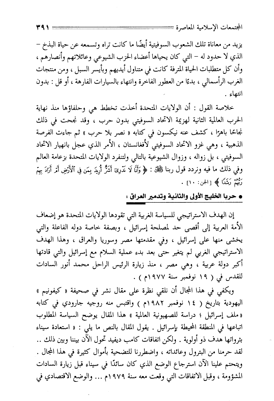 إن الهدف الاستراتيجي للسياسة الغربية التي تقودها الولايات المتحدة هو إضعاف الأمة العربية إلى أقصى حد لمصلحة إسرائيل، وبصفة خاصة دوله الفاعلة والتي يخشى منها على إسرائيل، وفي مقدمتها مصر وسوريا والعراق، وهذا الهدف الاستراتيجي الغربي لم يتغير حتى بعد بدء عملية السلام مع إسرائيل والتي قادتها أكبر دولة عربية، وهي مصر، منذ زيارة الرئيس الراحل محمد أنور السادات للقدس في (19 نوفمبر سنة 1977 م) .