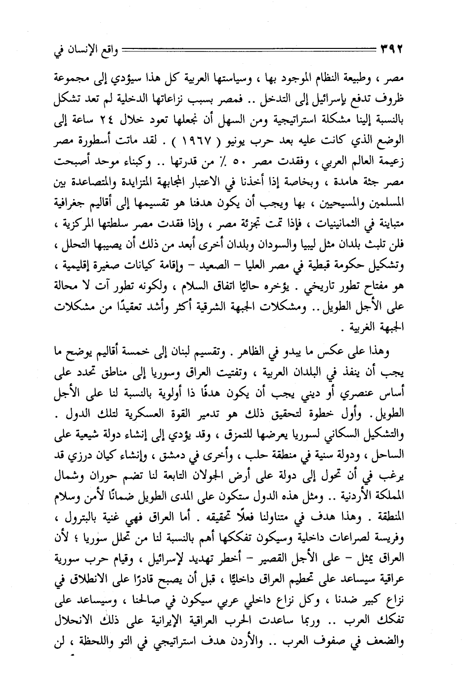 مصر، وطبيعة النظام الموجود بها، وسياستها العربية كل هذا سيؤدي إلى مجموعة ظروف تدفع بإسرائيل إلى التدخل.. فمصر بسبب نزاعاتها الدخلية لم تعد تشكل بالنسبة إلينا مشكلة استراتيجية ومن السهل أن نجعلها تعود خلال 24 ساعة إلى الوضع الذي كانت عليه بعد حرب يونيو (1967) . لقد ماتت أسطورة مصر زعيمة العالم العربي، وفقدت مصر 50 من قدرتها.. وكبناء موحد أصبحت مصر جثة هامدة، وبخاصة إذا أخذنا في الاعتبار المجابهة المتزايدة والمتصاعدة بين المسلمين والمسيحيين، بها ويجب أن يكون هدفنا هو تقسيمها إلى أقاليم جغرافية متباينة في الثمانينيات، فإذا تمت تجزئة مصر، وإذا فقدت مصر سلطتها المركزية، فلن تلبث بلدان مثل ليبيا والسودان وبلدان أخرى أبعد من ذلك أن يصيبها التحلل، وتشكيل حكومة قبطية في مصر العليا- الصعيد- وإقامة كيانات صغيرة إقليمية، هو مفتاح تطور تاريخي. يؤخره حاليا اتفاق السلام، ولكونه تطور آت لا محالة على الأجل الطويل.. ومشكلات الجبهة الشرقية أكثر وأشد تعقيدا من مشكلات الجبهة الغربية.