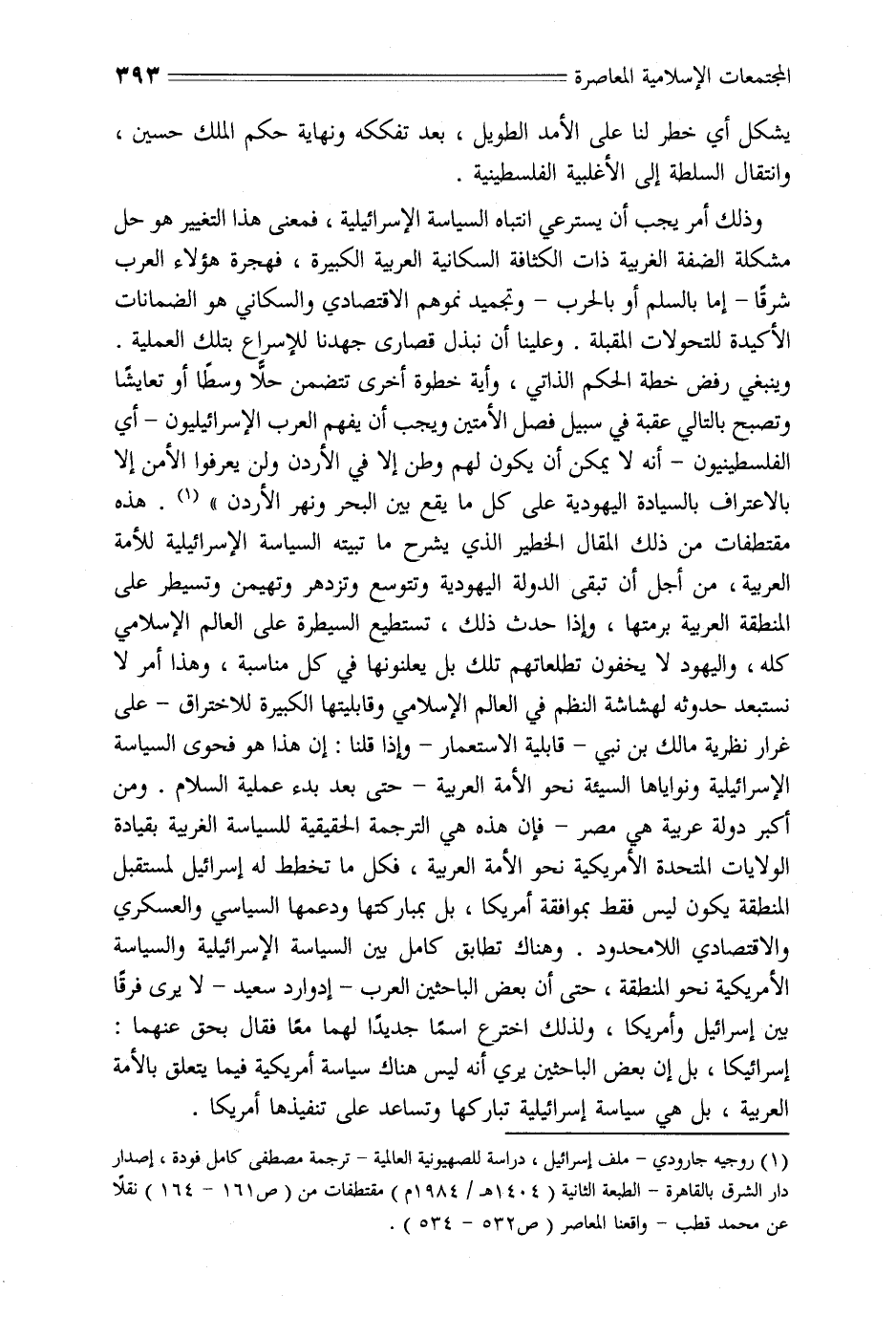 وينبغي رفض خطة الحكم الذاتي، وأية خطوة أخرى تتضمن حلّا وسطا أو تعايشا وتصبح بالتالي عقبة في سبيل فصل الأمتين ويجب أن يفهم العرب الإسرائيليون- أي الفلسطينيون- أنه لا يمكن أن يكون لهم وطن إلا في الأردن ولن يعرفوا الأمن إلا بالاعتراف بالسيادة اليهودية على كل ما يقع بين البحر ونهر الأردن» «1» . هذه مقتطفات من ذلك المقال الخطير الذي يشرح ما تبيته السياسة الإسرائيلية للأمة العربية، من أجل أن تبقى الدولة اليهودية وتتوسع وتزدهر وتهيمن وتسيطر على المنطقة العربية برمتها، وإذا حدث ذلك، تستطيع السيطرة على العالم الإسلامي كله، واليهود لا يخفون تطلعاتهم تلك بل يعلنونها في كل مناسبة، وهذا أمر لا نستبعد حدوثه لهشاشة النظم في العالم الإسلامي وقابليتها الكبيرة للاختراق- على غرار نظرية مالك بن نبي- قابلية الاستعمار- وإذا قلنا: إن هذا هو فحوى السياسة الإسرائيلية ونواياها السيئة نحو الأمة العربية- حتى بعد بدء عملية السلام. ومن أكبر دولة عربية هي مصر- فإن هذه هي الترجمة الحقيقية للسياسة الغربية بقيادة الولايات المتحدة الأمريكية نحو الأمة العربية، فكل ما تخطط له إسرائيل لمستقبل المنطقة يكون ليس فقط بموافقة أمريكا، بل بمباركتها ودعمها السياسي والعسكري والاقتصادي اللامحدود. وهناك تطابق كامل بين السياسة الإسرائيلية والسياسة الأمريكية نحو المنطقة، حتى أن بعض الباحثين العرب- إدوارد سعيد- لا يرى فرقا بين إسرائيل وأمريكا، ولذلك اخترع اسما جديدا لهما معا فقال بحق عنهما: