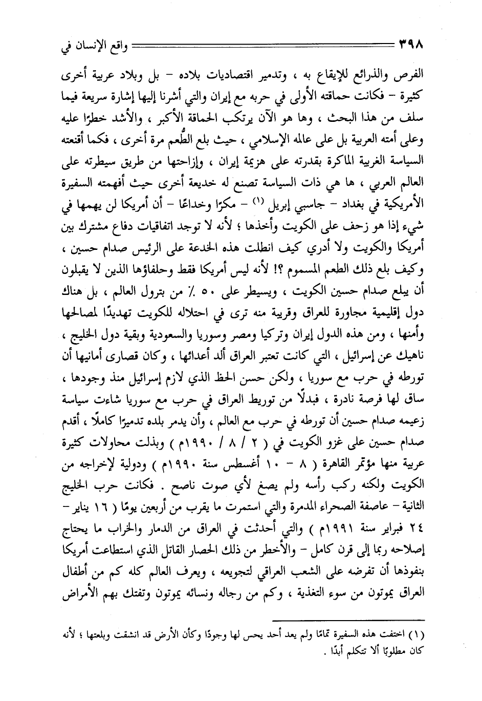 الفرص والذرائع للإيقاع به، وتدمير اقتصاديات بلاده- بل وبلاد عربية أخرى كثيرة- فكانت حماقته الأولى في حربه مع إيران والتي أشرنا إليها إشارة سريعة فيما سلف من هذا البحث، وها هو الآن يرتكب الحماقة الأكبر، والأشد خطرا عليه وعلى أمته العربية بل على عالمه الإسلامي، حيث بلع الطّعم مرة أخرى، فكما أقنعته السياسة الغربية الماكرة بقدرته على هزيمة إيران، وإزاحتها من طريق سيطرته على العالم العربي، ها هي ذات السياسة تصنع له خديعة أخرى حيث أفهمته السفيرة الأمريكية في بغداد- جاسبي إبريل «1» - مكرا وخداعا- أن أمريكا لن يهمها في شيء إذا هو زحف على الكويت وأخذها؛ لأنه لا توجد اتفاقيات دفاع مشترك بين أمريكا والكويت ولا أدري كيف انطلت هذه الخدعة على الرئيس صدام حسين، وكيف بلع ذلك الطعم المسموم؟! لأنه ليس أمريكا فقط وحلفاؤها الذين لا يقبلون أن يبلع صدام حسين الكويت، ويسيطر على 50 من بترول العالم، بل هناك دول إقليمية مجاورة للعراق وقريبة منه ترى في احتلاله للكويت تهديدا لمصالحها وأمنها، ومن هذه الدول إيران وتركيا ومصر وسوريا والسعودية وبقية دول الخليج، ناهيك عن إسرائيل، التي كانت تعتبر العراق ألد أعدائها، وكان قصارى أمانيها أن تورطه في حرب مع سوريا، ولكن حسن الحظ الذي لازم إسرائيل منذ وجودها، ساق لها فرصة نادرة، فبدلا من توريط العراق في حرب مع سوريا شاءت سياسة زعيمه صدام حسين أن تورطه في حرب مع العالم، وأن يدمر بلده تدميرا كاملا، أقدم صدام حسين على غزو الكويت في (2/ 8/ 1990 م) وبذلت محاولات كثيرة عربية منها مؤتمر القاهرة (8- 10 أغسطس سنة 1990 م) ودولية لإخراجه من الكويت ولكنه ركب رأسه ولم يصغ لأي صوت ناصح. فكانت حرب الخليج الثانية- عاصفة الصحراء المدمرة والتي استمرت ما يقرب من أربعين يوما (16 يناير- 24 فبراير سنة 1991 م) والتي أحدثت في العراق من الدمار والخراب ما يحتاج إصلاحه ربما إلى قرن كامل- والأخطر من ذلك الحصار القاتل الذي استطاعت أمريكا بنفوذها أن تفرضه على الشعب العراقي لتجويعه، ويعرف العالم كله كم من أطفال العراق يموتون من سوء التغذية، وكم من رجاله ونسائه يموتون وتفتك بهم الأمراض