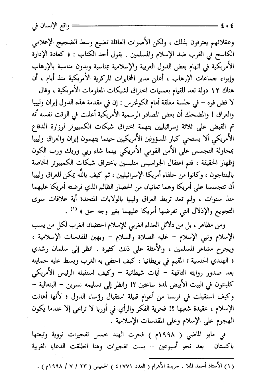 وعقلائهم يعترفون بذلك، ولكن الأصوات العاقلة تضيع وسط الضجيج الإعلامي الكاسح في الغرب ضد الإسلام والمسلمين. يقول أحد الكتاب: «كعادة الإدارة الأمريكية في اتهام بعض الدول العربية والإسلامية بمناسبة وبدون مناسبة بالإرهاب وإيواء جماعات الإرهاب، أعلن مدير المخابرات المركزية الأمريكية منذ أيام، أن هناك 12 دولة تعد للقيام بعمليات اختراق لشبكات المعلومات الأمريكية، وقال- لا فض فوه- في جلسة مغلقة أمام الكونجرس: إن في مقدمة هذه الدول إيران وليبيا والعراق! والمضحك أن بعض المصادر الرسمية الأمريكية أعلنت في الوقت نفسه أنه تم القبض على ثلاثة إسرائيليين بتهمة اختراق شبكات الكمبيوتر لوزارة الدفاع الأمريكي ألا يستحي كبار المسؤولين الأمريكيين حينما يتهمون إيران والعراق وليبيا بمحاولة التجسس على الأمن القومي الأمريكي بينما شاء ربي وربك ورب الكون إظهار الحقيقة، فتم اعتقال الجواسيس متلبسين باختراق شبكات الكمبيوتر الخاصة بالبنتاجون، وكانوا من حلفاء أمريكا الإسرائيليين، ثم كيف بالله يمكن للعراق وليبيا أن تتجسسا على أمريكا وهما تعانيان من الحصار الظالم الذي فرضته أمريكا عليهما منذ سنوات، ولم تعد تربط العراق وليبيا بالولايات المتحدة أية علاقات سوى التجويع والإذلال التي تفرضها أمريكا عليهما بغير وجه حق» «1» .