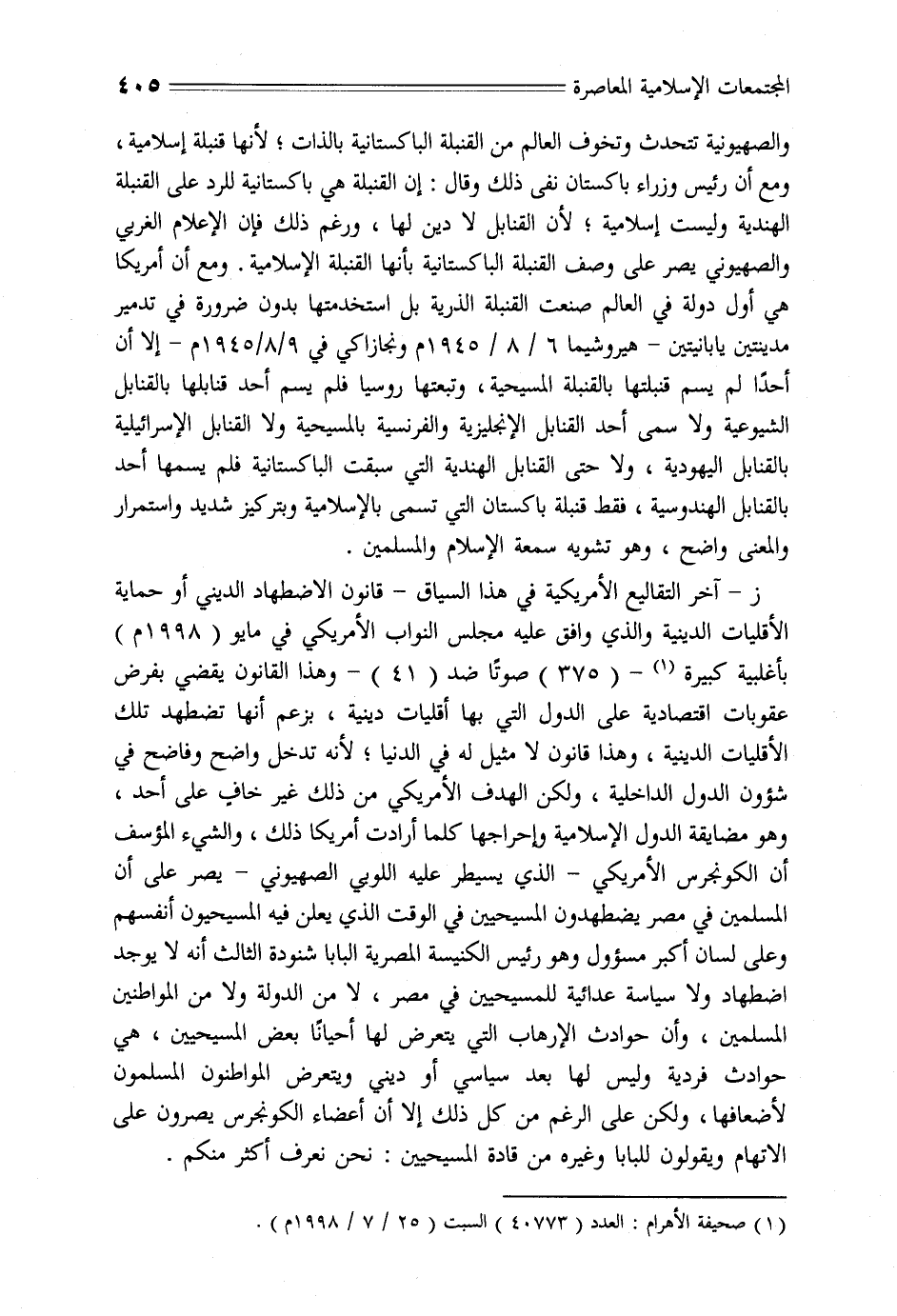 ز- آخر التقاليع الأمريكية في هذا السياق- قانون الاضطهاد الديني أو حماية الأقليات الدينية والذي وافق عليه مجلس النواب الأمريكي في مايو (1998 م) بأغلبية كبيرة «1» - (375) صوتا ضد (41) - وهذا القانون يقضي بفرض عقوبات اقتصادية على الدول التي بها أقليات دينية، بزعم أنها تضطهد تلك الأقليات الدينية، وهذا قانون لا مثيل له في الدنيا؛ لأنه تدخل واضح وفاضح في شؤون الدول الداخلية، ولكن الهدف الأمريكي من ذلك غير خاف على أحد، وهو مضايقة الدول الإسلامية وإحراجها كلما أرادت أمريكا ذلك، والشيء المؤسف أن الكونجرس الأمريكي- الذي يسيطر عليه اللوبي الصهيوني- يصر على أن المسلمين في مصر يضطهدون المسيحيين في الوقت الذي يعلن فيه المسيحيون أنفسهم وعلى لسان أكبر مسؤول وهو رئيس الكنيسة المصرية البابا شنودة الثالث أنه لا يوجد اضطهاد ولا سياسة عدائية للمسيحيين في مصر، لا من الدولة ولا من المواطنين المسلمين، وأن حوادث الإرهاب التي يتعرض لها أحيانا بعض المسيحيين، هي حوادث فردية وليس لها بعد سياسي أو ديني ويتعرض المواطنون المسلمون لأضعافها، ولكن على الرغم من كل ذلك إلا أن أعضاء الكونجرس يصرون على الاتهام ويقولون للبابا وغيره من قادة المسيحيين: نحن نعرف أكثر منكم.