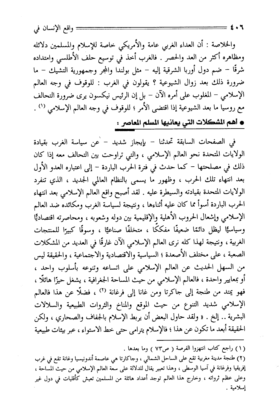 في الصفحات السابقة تحدثنا- بإيجاز شديد- عن سياسة الغرب بقيادة الولايات المتحدة نحو العالم الإسلامي، والتي تراوحت بين التحالف معه إذا كان ذلك في مصلحتها- كما حدث في فترة الحرب الباردة- إلى اعتباره العدو الأول بعد انتهاء تلك الحرب، وظهور ما يسمى بالنظام العالمي الجديد، الذي تنفرد الولايات المتحدة بقيادته والسيطرة عليه. لقد أصبح واقع العالم الإسلامي بعد انتهاء الحرب الباردة أسوأ مما كان عليه أثناءها، ونتيجة لسياسة الغرب ومكائده ضد العالم الإسلامي وإشعال الحروب الأهلية والإقليمية بين دوله وشعوبه، ومحاصرته اقتصاديّا وسياسيّا ليظل دائما ضعيفا مفككا، متخلفا صناعيّا، وسوقا كبيرا للمنتجات الغربية، ونتيجة لهذا كله نرى العالم الإسلامي الآن غارقا في العديد من المشكلات الصعبة، على مختلف الأصعدة؛ السياسية والاقتصادية والاجتماعية، والحقيقة ليس من السهل الحديث عن العالم الإسلامي على اتساعه وتنوعه بأسلوب واحد، أو بمعايير واحدة، فالعالم الإسلامي من حيث المساحة الجغرافية، يشغل حيزا هائلا، فهو يمتد من طنجة إلى جاكرتا ومن غانا إلى فرغانة «2» ، فضلا عن هذا فالعالم الإسلامي شديد التنوع من حيث الموقع والمناخ والثروات الطبيعية والسلالات البشرية.. إلخ. «ولقد حاول البعض أن يربط الإسلام بالجفاف والصحاري، ولكن الحقيقة أبعد ما تكون عن هذا؛ فالإسلام يترامى حتى خط الاستواء، عبر بيئات طبيعية