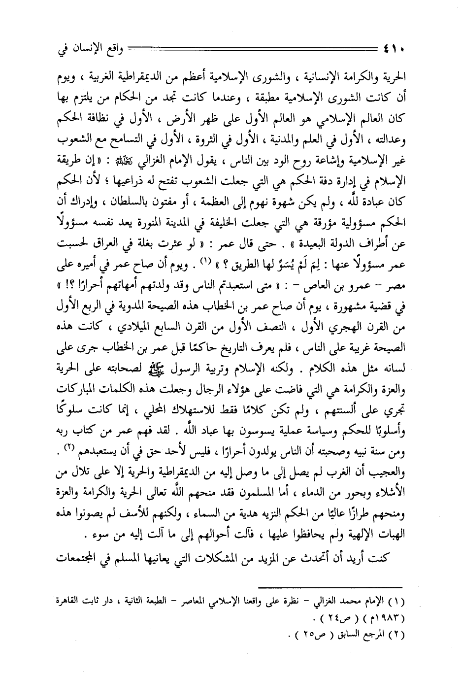 الحرية والكرامة الإنسانية، والشورى الإسلامية أعظم من الديمقراطية الغربية، ويوم أن كانت الشورى الإسلامية مطبقة، وعندما كانت تجد من الحكام من يلتزم بها كان العالم الإسلامي هو العالم الأول على ظهر الأرض، الأول في نظافة الحكم وعدالته، الأول في العلم والمدنية، الأول في الثروة، الأول في التسامح مع الشعوب غير الإسلامية وإشاعة روح الود بين الناس، يقول الإمام الغزالي رحمه الله: «إن طريقة الإسلام في إدارة دفة الحكم هي التي جعلت الشعوب تفتح له ذراعيها؛ لأن الحكم كان عبادة لله، ولم يكن شهوة نهوم إلى العظمة، أو مفتون بالسلطان، وإدراك أن الحكم مسؤولية مؤرقة هي التي جعلت الخليفة في المدينة المنورة يعد نفسه مسؤولا عن أطراف الدولة البعيدة» . حتى قال عمر: «لو عثرت بغلة في العراق لحسبت عمر مسؤولا عنها: لم لم يسوّ لها الطريق؟» «1» . ويوم أن صاح عمر في أميره على مصر- عمرو بن العاص-: «متى استعبدتم الناس وقد ولدتهم أمهاتهم أحرارا؟!» في قضية مشهورة، يوم أن صاح عمر بن الخطاب هذه الصيحة المدوية في الربع الأول من القرن الهجري الأول، النصف الأول من القرن السابع الميلادي، كانت هذه الصيحة غريبة على الناس، فلم يعرف التاريخ حاكما قبل عمر بن الخطاب جرى على لسانه مثل هذه الكلام. ولكنه الإسلام وتربية الرسول صلّى الله عليه وسلم لصحابته على الحرية والعزة والكرامة هي التي فاضت على هؤلاء الرجال وجعلت هذه الكلمات المباركات تجري على ألسنتهم، ولم تكن كلاما فقط للاستهلاك المحلي، إنما كانت سلوكا وأسلوبا للحكم وسياسة عملية يسوسون بها عباد الله. لقد فهم عمر من كتاب ربه ومن سنة نبيه وصحبته أن الناس يولدون أحرارا، فليس لأحد حق في أن يستعبدهم «2» .