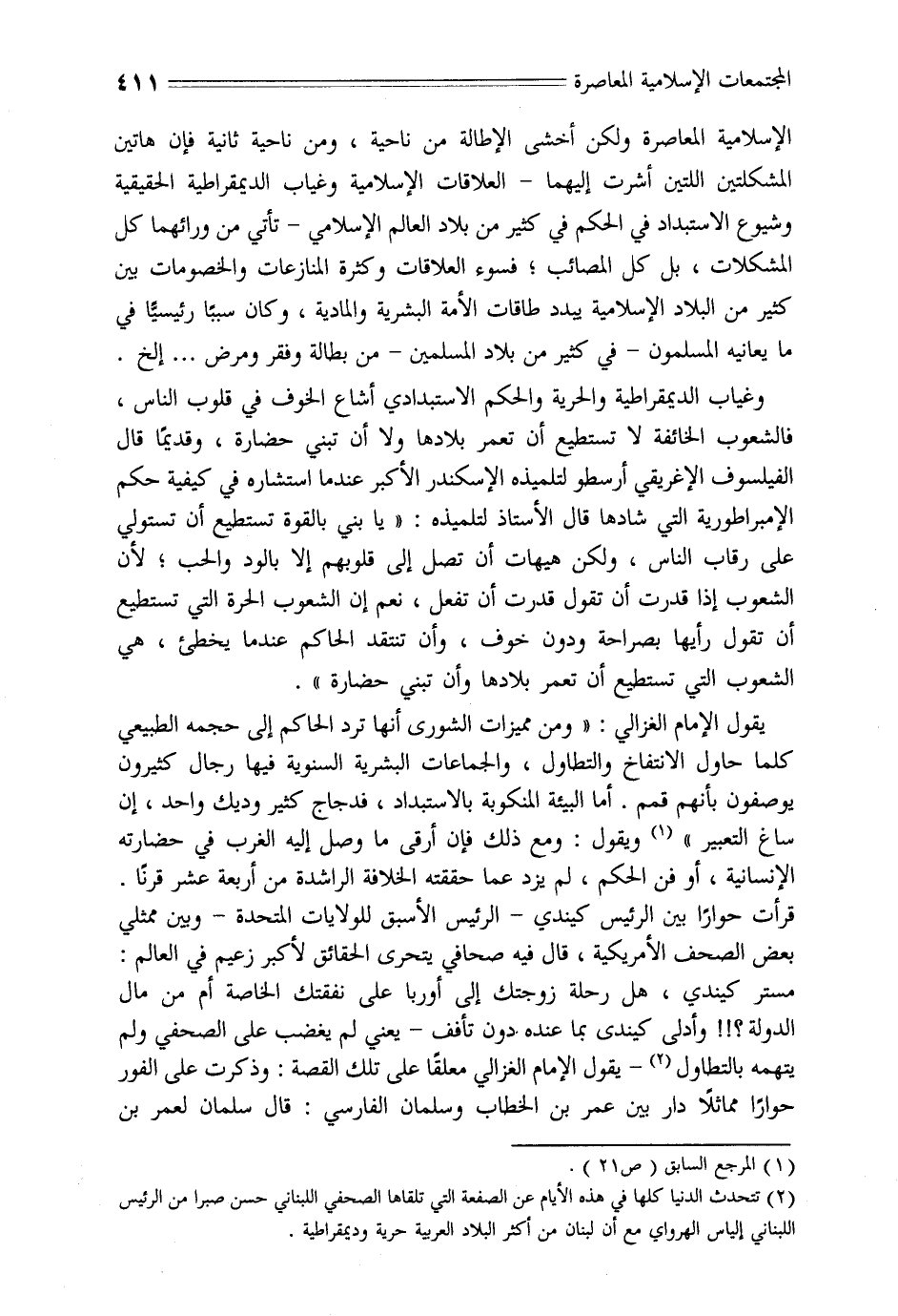 مستر كيندي، هل رحلة زوجتك إلى أوربا على نفقتك الخاصة أم من مال الدولة؟!! وأدلى كيندى بما عنده دون تأفف- يعني لم يغضب على الصحفي ولم يتهمه بالتطاول «2» - يقول الإمام الغزالي معلقا على تلك القصة: وذكرت على الفور حوارا مماثلا دار بين عمر بن الخطاب وسلمان الفارسي: قال سلمان لعمر بن