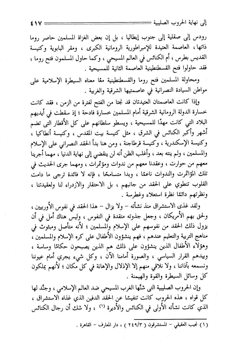 وإن الحروب الصليبية التى شنّها الغرب المسيحي ضد العالم الإسلامي، وجنّد لها كل قواه، هذه الحروب كانت تنفيسا عن الحقد الدفين الذي غذاه الاستشراق، الذي كانت نشأته الأولى في الكنائس والأديرة «1» ، ولا شك أن رجال الكنائس