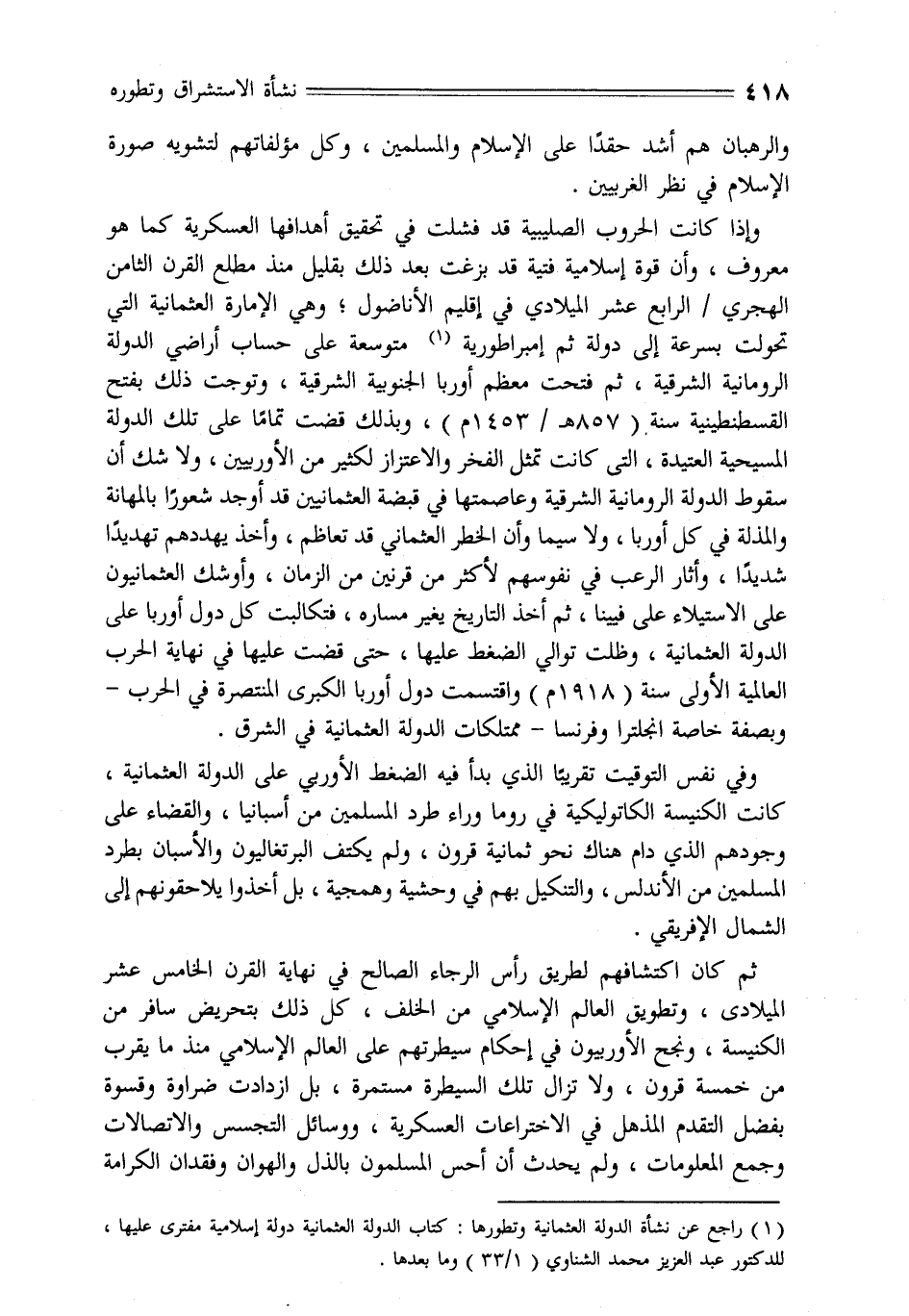 وإذا كانت الحروب الصليبية قد فشلت في تحقيق أهدافها العسكرية كما هو معروف، وأن قوة إسلامية فتية قد بزغت بعد ذلك بقليل منذ مطلع القرن الثامن الهجري/ الرابع عشر الميلادي في إقليم الأناضول؛ وهي الإمارة العثمانية التي تحولت بسرعة إلى دولة ثم إمبراطورية «1» متوسعة على حساب أراضي الدولة الرومانية الشرقية، ثم فتحت معظم أوربا الجنوبية الشرقية، وتوجت ذلك بفتح القسطنطينية سنة (857 هـ/ 1453 م) ، وبذلك قضت تماما على تلك الدولة المسيحية العتيدة، التى كانت تمثل الفخر والاعتزاز لكثير من الأوربيين، ولا شك أن سقوط الدولة الرومانية الشرقية وعاصمتها في قبضة العثمانيين قد أوجد شعورا بالمهانة والمذلة في كل أوربا، ولا سيما وأن الخطر العثماني قد تعاظم، وأخذ يهددهم تهديدا شديدا، وأثار الرعب في نفوسهم لأكثر من قرنين من الزمان، وأوشك العثمانيون على الاستيلاء على فيينا، ثم أخذ التاريخ يغير مساره، فتكالبت كل دول أوربا على الدولة العثمانية، وظلت توالي الضغط عليها، حتى قضت عليها في نهاية الحرب العالمية الأولى سنة (1918 م) واقتسمت دول أوربا الكبرى المنتصرة في الحرب- وبصفة خاصة انجلترا وفرنسا- ممتلكات الدولة العثمانية في الشرق.