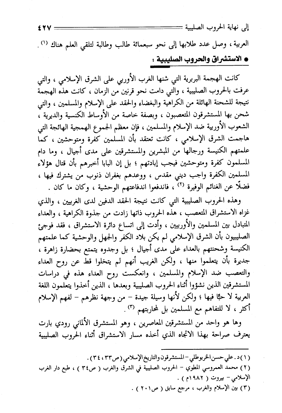 وها هو واحد من المستشرقين المعاصرين، وهو المستشرق الألماني رودي بارت يعترف صراحة بهذا الاتجاه الذي أخذه مسار الاستشراق أثناء الحروب الصليبية