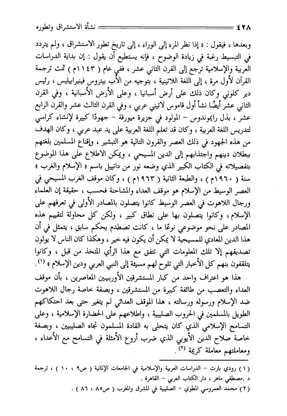 هذا هو اعتراف واحد من كبار المستشرقين الأوربيين المعاصرين، بأن موقف العداء والتعصب من طائفة كبيرة من المستشرقين، وبصفة خاصة رجال اللاهوت ضد الإسلام ورسوله ورسالته، هذا الموقف العدائي لم يتغير حتى بعد احتكاكهم الطويل بالمسلمين في الحروب الصليبية، واطلاعهم على الحضارة الإسلامية، وعلى التسامح الإسلامي الذي كان يتحلى به القادة المسلمون تجاه الصليبيين، وبصفة خاصة صلاح الدين الأيوبي الذي ضرب أروع الأمثلة في التسامح مع الأعداء، ومعاملتهم معاملة كريمة «2» .