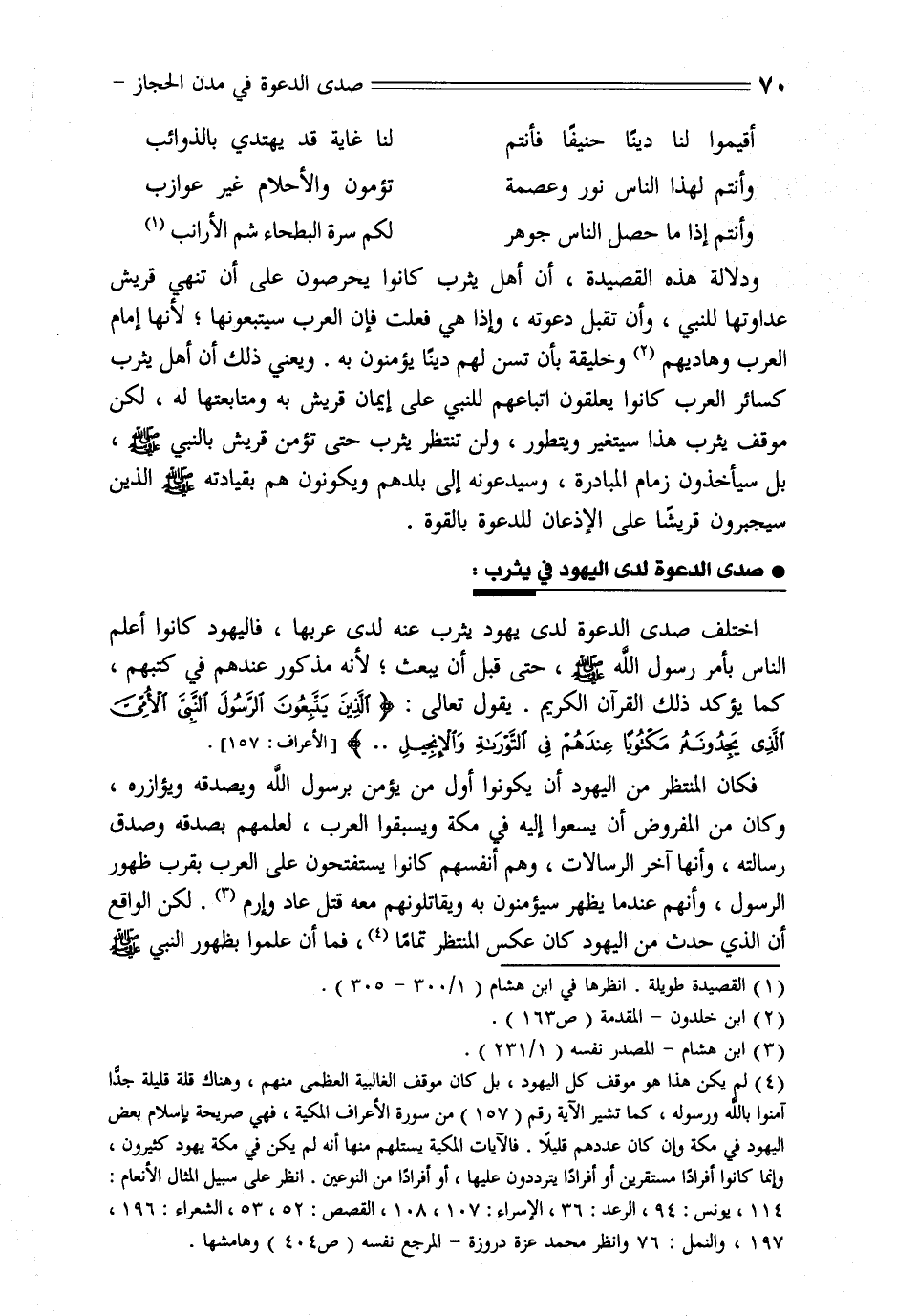 (4) لم يكن هذا هو موقف كل اليهود، بل كان موقف الغالبية العظمى منهم، وهناك قلة قليلة جدّا آمنوا بالله ورسوله، كما تشير الآية رقم (157) من سورة الأعراف المكية، فهي صريحة بإسلام بعض اليهود في مكة وإن كان عددهم قليلا. فالآيات المكية يستلهم منها أنه لم يكن في مكة يهود كثيرون، وإنما كانوا أفرادا مستقرين أو أفرادا يترددون عليها، أو أفرادا من النوعين. انظر على سبيل المثال الأنعام: 114، يونس: 94، الرعد: 36، الإسراء: 107، 108، القصص: 52، 53، الشعراء: 196، 197، والنمل: 76 وانظر محمد عزة دروزة- المرجع نفسه (ص 404) وهامشها.