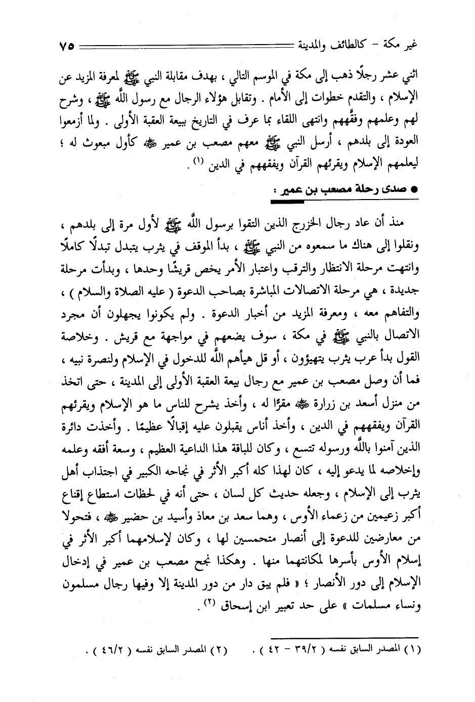 اثني عشر رجلا ذهب إلى مكة في الموسم التالي، بهدف مقابلة النبي صلّى الله عليه وسلم لمعرفة المزيد عن الإسلام، والتقدم خطوات إلى الأمام. وتقابل هؤلاء الرجال مع رسول الله صلّى الله عليه وسلم، وشرح لهم وعلمهم وفقّههم وانتهى اللقاء بما عرف في التاريخ ببيعة العقبة الأولى. ولما أزمعوا العودة إلى بلدهم، أرسل النبي صلّى الله عليه وسلم معهم مصعب بن عمير رضى الله عنه كأول مبعوث له؛ ليعلمهم الإسلام ويقرئهم القرآن ويفقههم في الدين «1» .