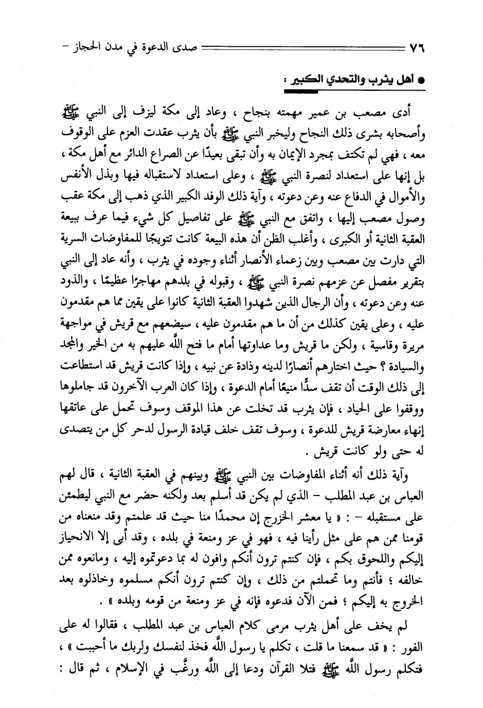 وآية ذلك أنه أثناء المفاوضات بين النبي صلّى الله عليه وسلم وبينهم في العقبة الثانية، قال لهم العباس بن عبد المطلب- الذي لم يكن قد أسلم بعد ولكنه حضر مع النبي ليطمئن على مستقبله-: «يا معشر الخزرج إن محمدا منا حيث قد علمتم وقد منعناه من قومنا ممن هم على مثل رأينا فيه، فهو في عز ومنعة في بلده، وقد أبى إلا الانحياز إليكم واللحوق بكم، فإن كنتم ترون أنكم وافون له بما دعوتموه إليه، ومانعوه ممن خالفه؛ فأنتم وما تحملتم من ذلك، وإن كنتم ترون أنكم مسلموه وخاذلوه بعد الخروج به إليكم؛ فمن الآن فدعوه فإنه في عز ومنعة من قومه وبلده» .