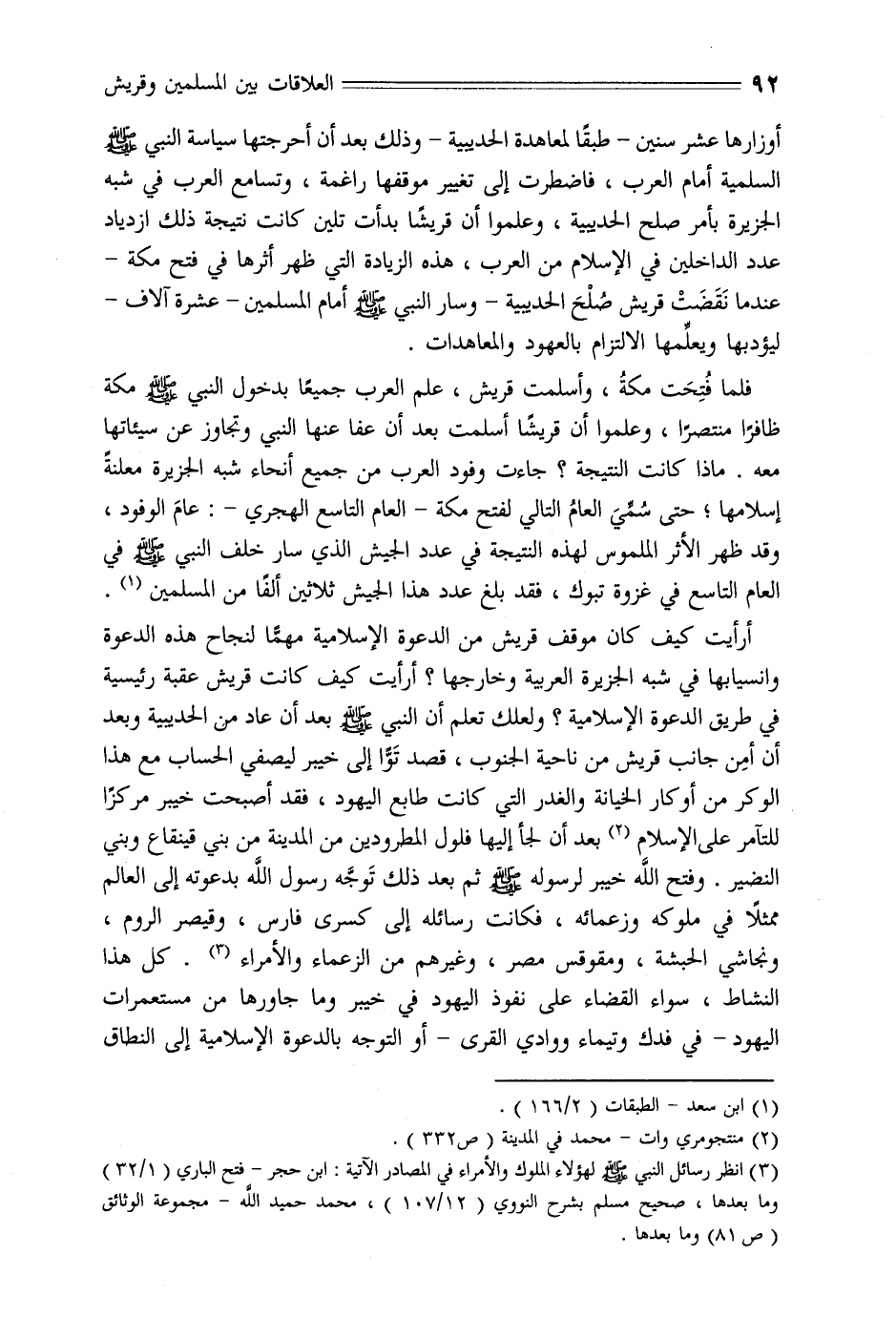أرأيت كيف كان موقف قريش من الدعوة الإسلامية مهمّا لنجاح هذه الدعوة وانسيابها في شبه الجزيرة العربية وخارجها؟ أرأيت كيف كانت قريش عقبة رئيسية في طريق الدعوة الإسلامية؟ ولعلك تعلم أن النبي صلّى الله عليه وسلم بعد أن عاد من الحديبية وبعد أن أمن جانب قريش من ناحية الجنوب، قصد توّا إلى خيبر ليصفي الحساب مع هذا الوكر من أوكار الخيانة والغدر التي كانت طابع اليهود، فقد أصبحت خيبر مركزا للتامر على الإسلام «2» بعد أن لجأ إليها فلول المطرودين من المدينة من بني قينقاع وبني النضير. وفتح الله خيبر لرسوله صلّى الله عليه وسلم ثم بعد ذلك توجّه رسول الله بدعوته إلى العالم ممثلا في ملوكه وزعمائه، فكانت رسائله إلى كسرى فارس، وقيصر الروم، ونجاشي الحبشة، ومقوقس مصر، وغيرهم من الزعماء والأمراء «3» . كل هذا النشاط، سواء القضاء على نفوذ اليهود في خيبر وما جاورها من مستعمرات اليهود- في فدك وتيماء ووادي القرى- أو التوجه بالدعوة الإسلامية إلى النطاق