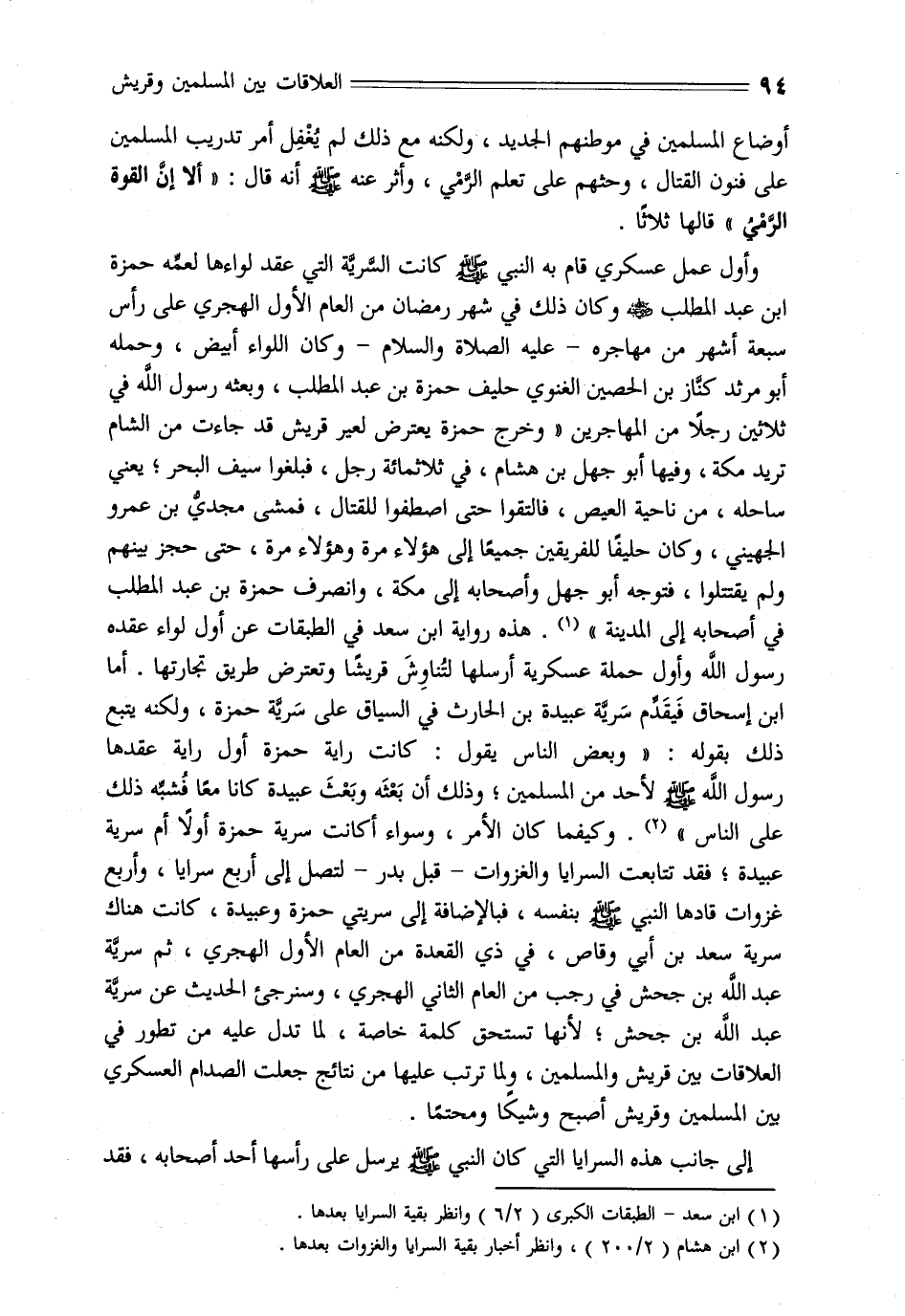وأول عمل عسكري قام به النبي صلّى الله عليه وسلم كانت السّريّة التي عقد لواءها لعمّه حمزة ابن عبد المطلب رضي الله عنه وكان ذلك في شهر رمضان من العام الأول الهجري على رأس سبعة أشهر من مهاجره- عليه الصلاة والسلام- وكان اللواء أبيض، وحمله أبو مرثد كنّاز بن الحصين الغنوي حليف حمزة بن عبد المطلب، وبعثه رسول الله في ثلاثين رجلا من المهاجرين «وخرج حمزة يعترض لعير قريش قد جاءت من الشام تريد مكة، وفيها أبو جهل بن هشام، في ثلاثمائة رجل، فبلغوا سيف البحر؛ يعني ساحله، من ناحية العيص، فالتقوا حتى اصطفوا للقتال، فمشى مجديّ بن عمرو الجهيني، وكان حليفا للفريقين جميعا إلى هؤلاء مرة وهؤلاء مرة، حتى حجز بينهم ولم يقتتلوا، فتوجه أبو جهل وأصحابه إلى مكة، وانصرف حمزة بن عبد المطلب في أصحابه إلى المدينة» «1» . هذه رواية ابن سعد في الطبقات عن أول لواء عقده رسول الله وأول حملة عسكرية أرسلها لتناوش قريشا وتعترض طريق تجارتها. أما ابن إسحاق فيقدّم سريّة عبيدة بن الحارث في السياق على سريّة حمزة، ولكنه يتبع ذلك بقوله: «وبعض الناس يقول: كانت راية حمزة أول راية عقدها رسول الله صلّى الله عليه وسلم لأحد من المسلمين؛ وذلك أن بعثه وبعث عبيدة كانا معا فشبّه ذلك على الناس» «2» . وكيفما كان الأمر، وسواء أكانت سرية حمزة أولا أم سرية عبيدة؛ فقد تتابعت السرايا والغزوات- قبل بدر- لتصل إلى أربع سرايا، وأربع غزوات قادها النبي صلّى الله عليه وسلم بنفسه، فبالإضافة إلى سريتي حمزة وعبيدة، كانت هناك سرية سعد بن أبي وقاص، في ذي القعدة من العام الأول الهجري، ثم سريّة عبد الله بن جحش في رجب من العام الثاني الهجري، وسنرجئ الحديث عن سريّة عبد الله بن جحش؛ لأنها تستحق كلمة خاصة، لما تدل عليه من تطور في العلاقات بين قريش والمسلمين، ولما ترتب عليها من نتائج جعلت الصدام العسكري بين المسلمين وقريش أصبح وشيكا ومحتما.