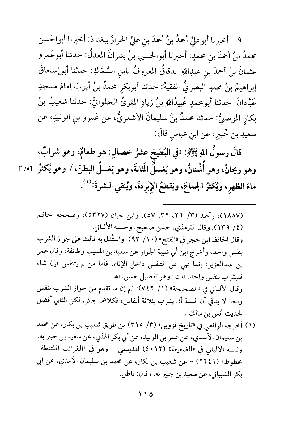 9 - أخبرنا أبو عليٍّ أحمدُ بنُ أحمدَ بنِ عليٍّ الخرازُ ببغدادَ: أخبرنا أبو الحسنِ محمدُ بنُ أحمدَ بنِ محمدٍ: أخبرنا أبو الحسينِ بنُ بشرانَ المعدلُ: حدثنا أبو عَمرو عثمانُ بنُ أحمدَ بنِ عبدِ اللهِ الدقاقُ المعروفُ بابنِ السَّمَّاكِ: حدثنا أبو إسحاقَ إبراهيمُ بنُ محمدٍ البصريُّ الفقيهُ: حدثنا أبو بكرٍ محمدُ بنُ أيوبَ إمامُ مسجدِ عَبَّادانَ: حدثنا أبو محمدٍ عُبيدُ اللهِ بنُ زيادٍ المقرئُ الحلوانيُّ: حدثنا شعيبُ بنُ بكارٍ الموصليُّ: حدثنا محمدُ بنُ سليمانَ الأشعريُّ، عن عَمرو بنِ الوليدِ، عن سعيدِ بنِ جُبيرٍ، عن ابنِ عباسٍ قالَ: