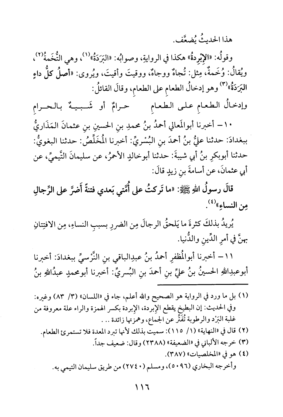 10 - أخبرنا أبو المَعالي أحمدُ بنُ محمدِ بنِ الحسينِ بنِ عثمانَ المَذَاريُّ ببغدادَ: حدثنا عليُّ بنُ أحمدَ بنِ البُسْريِّ: أخبرنا المُخَلِّصُ: حدثنا البغويُّ: حدثنا أبو بكرِ بنُ أبي شيبةَ: حدثنا أبو خالدٍ الأحمرُ، عن سليمانَ التَّيميِّ، عن أبي عثمانَ، عن أسامةَ بنِ زيدٍ قالَ: