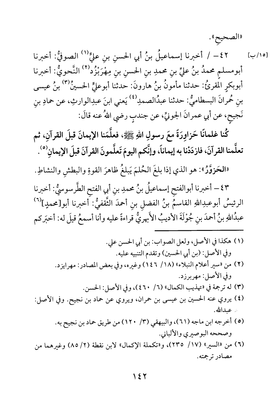 42 - / أخبرنا إسماعيلُ بنُ أبي الحسنِ بنِ عليٍّ (¬1) الصوفيُّ: أخبرنا أبو مسلمٍ محمدُ بنُ عليِّ بنِ محمدِ بنِ الحسنِ بنِ مِهْرَبْزُد (¬2) النَّحويُّ: أخبرنا أبو بكرٍ المقرئُ: حدثنا مأمونُ بنُ هارونَ: حدثنا أبو عليٍّ الحسينُ (¬3) بنُ عيسى بنِ حُمرانَ البسطاميُّ: حدثنا عبدُ الصمدِ (¬4) يَعني ابنَ عبدِ الوارثِ، عن حمادِ بنِ نَجيحٍ، عن أبي عمرانَ الجونيِّ، عن جندبٍ رضي اللهُ عنه قالَ: