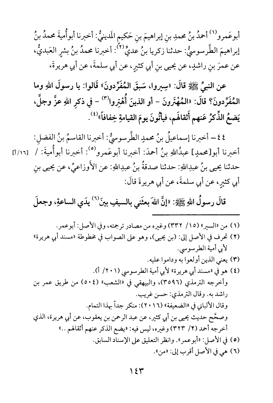 أبو عَمرو (¬1) أحمدُ بنُ محمدِ بنِ إبراهيمَ بنِ حَكيمٍ المَدينيُّ: أخبرنا أبو أُميةَ محمدُ بنُ إبراهيمَ الطَّرسوسيُّ: حدثنا زكريا بنُ عديٍّ (¬2): أخبرنا محمدُ بنُ بشرٍ العَبديُّ، عن عمرَ بنِ راشدٍ، عن يحيى بنِ أبي كثيرٍ، عن أبي سلمةَ، عن أبي هريرةَ،
