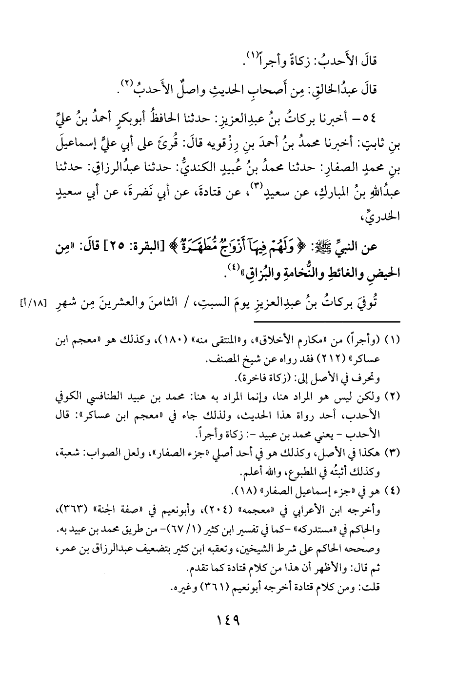 (¬2) ولكن ليس هو المراد هنا، وإنما المراد به هنا: محمد بن عبيد الطنافسي الكوفي الأحدب، أحد رواة هذا الحديث، ولذلك جاء في «معجم ابن عساكر»: قال الأحدب - يعني محمد بن عبيد -: زكاة وأجراً.