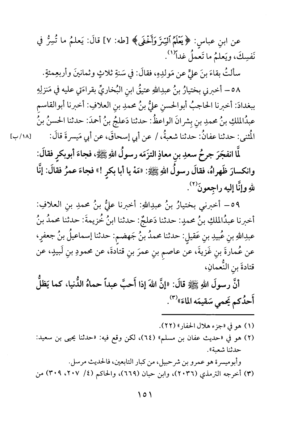 58 - أخبرني بختيارُ بنُ عبدِ اللهِ عتيقُ ابنِ البُخاريِّ بقراءَتي عليه في مَنزلِهِ ببغدادَ: أخبرنا الحاجبُ أبو الحسنِ عليُّ بنُ محمدِ بنِ العلافِ: أخبرنا أبو القاسمِ عبدُ الملكِ بنُ محمدِ بنِ بِشرانَ الواعظُ: حدثنا دَعلجُ بنُ أحمدَ: حدثنا الحسنُ بنُ المُثنى: حدثنا عفانُ: حدثنا شعبةُ، / عن أبي إسحاقَ، عن أبي مَيسرةَ قالَ: