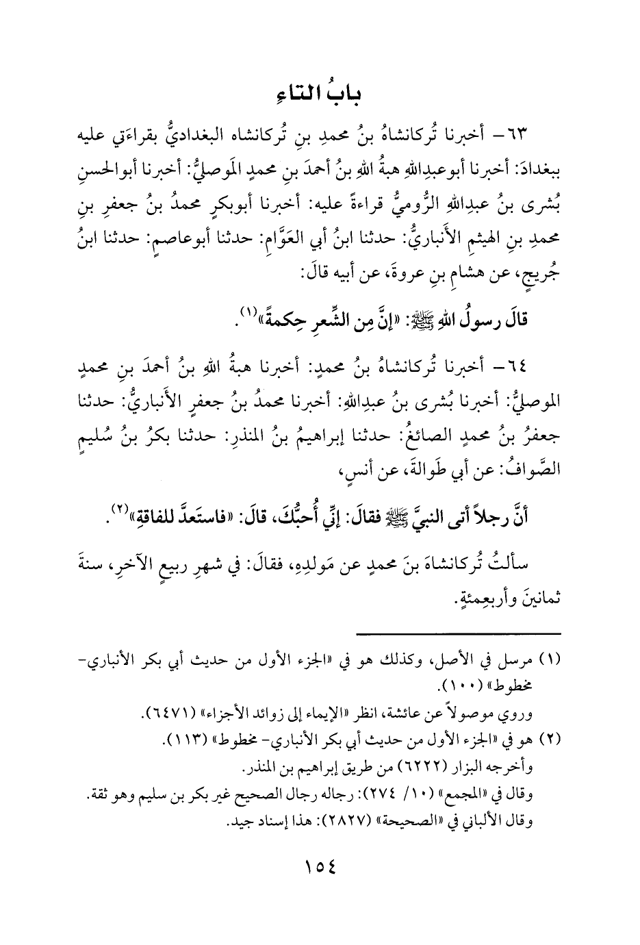 63 - أخبرنا تُركانشاهُ بنُ محمدِ بنِ تُركانشاه البغداديُّ بقراءَتي عليه ببغدادَ: أخبرنا أبو عبدِ اللهِ هبةُ اللهِ بنُ أحمدَ بنِ محمدٍ المَوصليُّ: أخبرنا أبو الحسنِ بُشرى بنُ عبدِ اللهِ الرُّوميُّ قراءةً عليه: أخبرنا أبو بكرٍ محمدُ بنُ جعفرِ بنِ محمدِ بنِ الهيثمِ الأَنباريُّ: حدثنا ابنُ أبي العَوَّامِ: حدثنا أبو عاصمٍ: حدثنا ابنُ جُريجٍ، عن هشامِ بنِ عروةَ، عن أبيه قالَ: