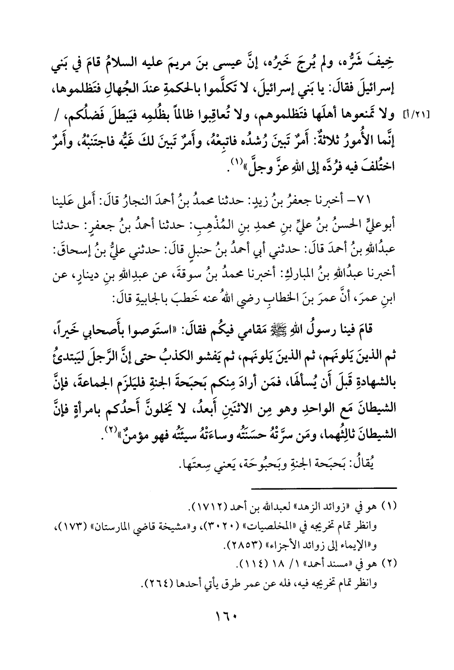 71 - أخبرنا جعفرُ بنُ زيدٍ: حدثنا محمدُ بنُ أحمدَ النجارُ قالَ: أَملى عَلينا أبو عليٍّ الحسنُ بنُ عليِّ بنِ محمدِ بنِ المُذْهِبِ: حدثنا أحمدُ بنُ جعفرٍ: حدثنا عبدُ اللهِ بنُ أحمدَ قالَ: حدثني أبي أحمدُ بنُ حنبلٍ قالَ: حدثني عليُّ بنُ إسحاقَ: أخبرنا عبدُ اللهِ بنُ المباركِ: أخبرنا محمدُ بنُ سوقةَ، عن عبدِ اللهِ بنِ دينارٍ، عن ابنِ عمرَ، أنَّ عمرَ بنَ الخطابِ رضي اللهُ عنه خَطبَ بالجابيةِ قالَ: