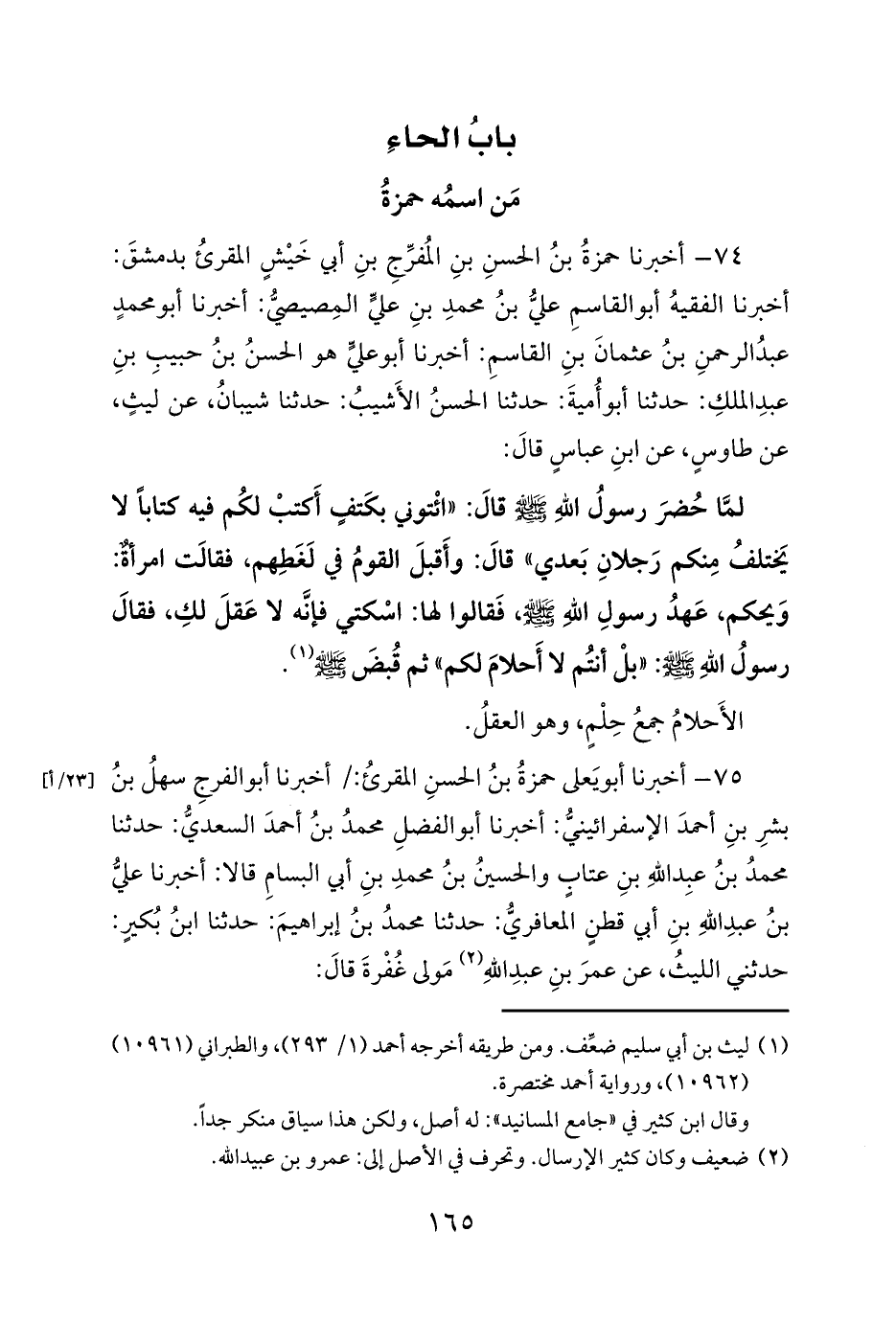 75 - أخبرنا أبو يَعلى حمزةُ بنُ الحسنِ المقرئُ:/ أخبرنا أبو الفرجِ سهلُ بنُ بشرِ بنِ أحمدَ الإسفرائينيُّ: أخبرنا أبو الفضلِ محمدُ بنُ أحمدَ السعديُّ: حدثنا محمدُ بنُ عبِداللهِ بنِ عتابٍ والحسينُ بنُ محمدِ بنِ أبي البسامِ قالا: أخبرنا عليُّ بنُ عبدِ اللهِ بنِ أبي قطنٍ المعافريُّ: حدثنا محمدُ بنُ إبراهيمَ: حدثنا ابنُ بُكيرٍ: حدثني الليثُ، عن عمرَ بنِ عبدِ اللهِ (¬2) مَولى غُفْرةَ قالَ: