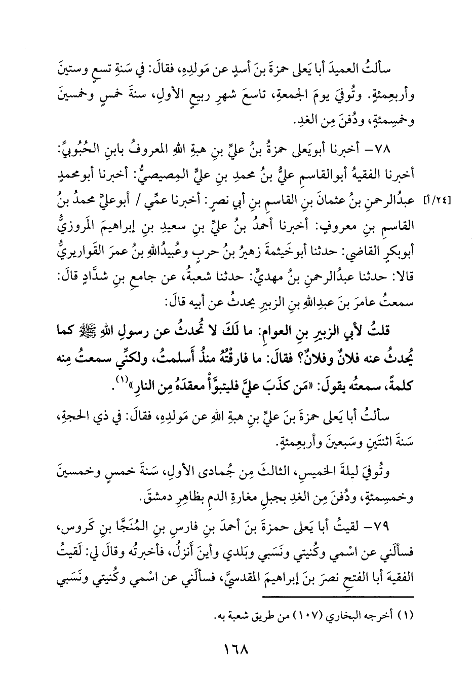 79 - لقيتُ أبا يَعلى حمزةَ بنَ أحمدَ بنِ فارسِ بنِ المُنَجَّا بنِ كَروس، فسألَني عن اسْمي وكُنيتي ونَسَبي وبَلدي وأينَ أَنزلُ، فأخبرتُه وقالَ لي: لَقيتُ الفقيهَ أبا الفتحِ نصرَ بنَ إبراهيمَ المقدسيَّ، فسألَني عن اسْمي وكُنيتي ونَسَبي