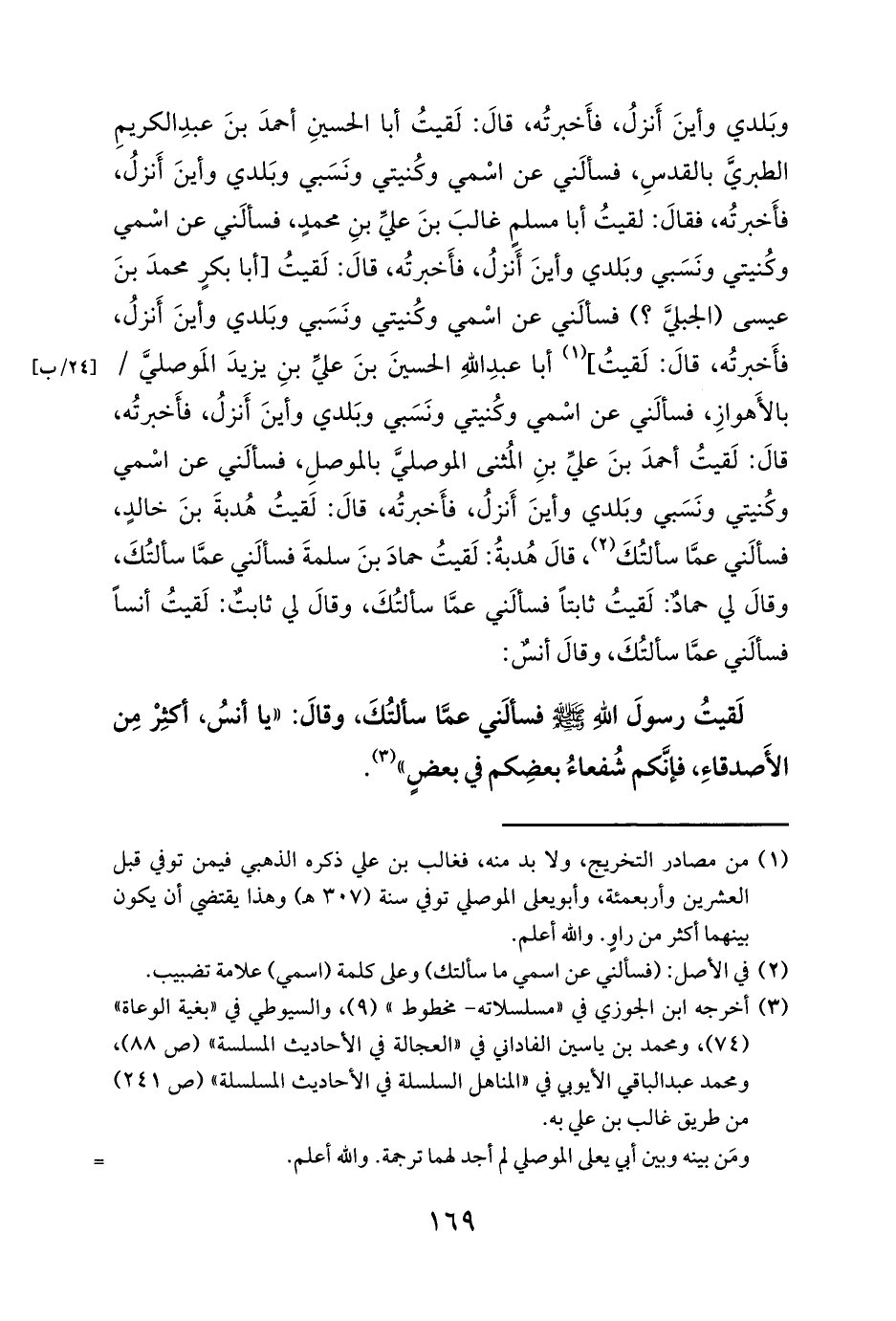 وبَلدي وأينَ أَنزلُ، فأَخبرتُه، قالَ: لَقيتُ أبا الحسينِ أحمدَ بنَ عبدِ الكريمِ الطبريَّ بالقدسِ، فسألَني عن اسْمي وكُنيتي ونَسَبي وبَلدي وأينَ أَنزلُ، فأَخبرتُه، فقالَ: لقيتُ أبا مسلمٍ غالبَ بنَ عليِّ بنِ محمدٍ، فسألَني عن اسْمي وكُنيتي ونَسَبي وبَلدي وأينَ أَنزلُ، فأَخبرتُه، قالَ: لَقيتُ [أبا بكرٍ محمدَ بنَ عيسى (الجبليَّ؟) فسألَني عن اسْمي وكُنيتي ونَسَبي وبَلدي وأينَ أَنزلُ، فأَخبرتُه، قالَ: لَقيتُ] (¬1) أبا عبدِ اللهِ الحسينَ بنَ عليِّ بنِ يزيدَ المَوصليَّ / بالأَهوازِ، فسألَني عن اسْمي وكُنيتي ونَسَبي وبَلدي وأينَ أَنزلُ، فأَخبرتُه، قالَ: لَقيتُ أحمدَ بنَ عليِّ بنِ المُثنى الموصليَّ بالموصلِ، فسألَني عن اسْمي وكُنيتي ونَسَبي وبَلدي وأينَ أَنزلُ، فأَخبرتُه، قالَ: لَقيتُ هُدبةَ بنَ خالدٍ، فسألَني عمَّا سألتُكَ (¬2)، قالَ هُدبةُ: لَقيتُ حمادَ بنَ سلمةَ فسألَني عمَّا سألتُكَ، وقالَ لي حمادٌ: لَقيتُ ثابتاً فسألَني عمَّا سألتُكَ، وقالَ لي ثابتٌ: لَقيتُ أنساً فسألَني عمَّا سألتُكَ، وقالَ أنسٌ: