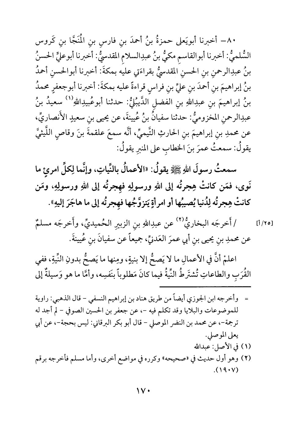 80 - أخبرنا أبو يَعلى حمزةُ بنُ أحمدَ بنِ فارسِ بنِ المُنَجَّا بنِ كَروس السُّلميُّ: أخبرنا أبو القاسمِ مكيُّ بنُ عبدِ السلامِ المقدسيُّ: أخبرنا أبو عليٍّ الحسنُ بنُ عبدِ الرحمنِ بنِ الحسنِ المقدسيُّ بقراءَتي عليه بمكةَ: أخبرنا أبو الحسنِ أحمدُ بنُ إبراهيمَ بنِ أحمدَ بنِ عليِّ بنِ فراسٍ قراءةً عليه بمكةَ: أخبرنا أبو جعفرٍ محمدُ بنُ إبراهيمَ بنِ عبدِ اللهِ بنِ الفضلِ الدَّيبُليُّ: حدثنا أبو عُبيدِ اللهِ (¬1) سعيدُ بنُ عبدِ الرحمنِ المخزوميُّ: حدثنا سفيانُ بنُ عُيينةَ، عن يحيى بنِ سعيدٍ الأَنصاريِّ، عن محمدِ بنِ إبراهيمَ بنِ الحارثِ التَّيميِّ، أنَّه سمعَ علقمةَ بنَ وقاصٍ اللَّيثيَّ يقولُ: سمعتُ عمرَ بنَ الخطابِ على المنبرِ يقولُ: