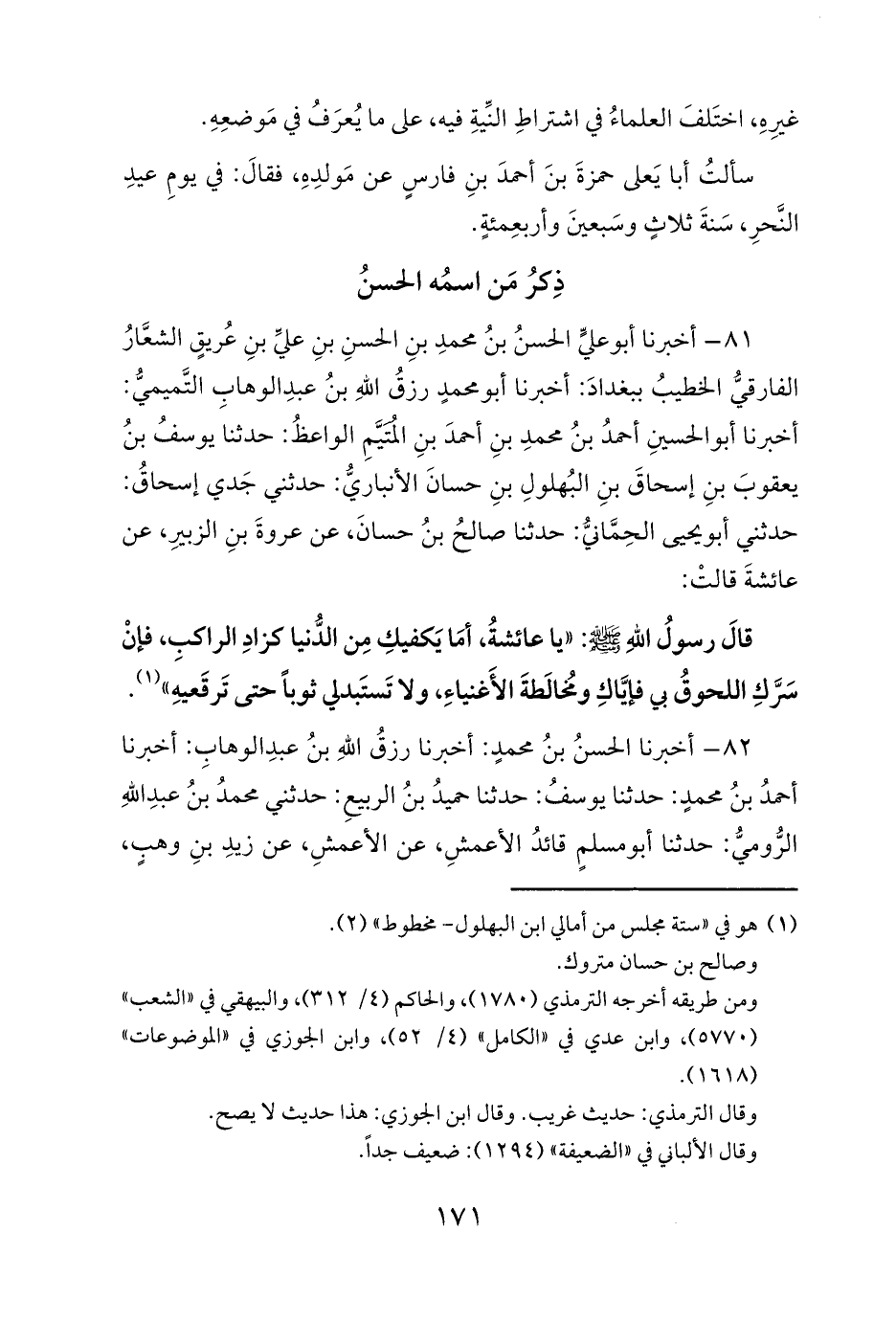 81 - أخبرنا أبو عليٍّ الحسنُ بنُ محمدِ بنِ الحسنِ بنِ عليِّ بنِ عُريقٍ الشعَّارُ الفارقيُّ الخطيبُ ببغدادَ: أخبرنا أبو محمدٍ رزقُ اللهِ بنُ عبدِ الوهابِ التَّميميُّ: أخبرنا أبو الحسينِ أحمدُ بنُ محمدِ بنِ أحمدَ بنِ المُتَيَّمِ الواعظُ: حدثنا يوسفُ بنُ يعقوبَ بنِ إسحاقَ بنِ البُهلولِ بنِ حسانَ الأنباريُّ: حدثني جَدي إسحاقُ: حدثني أبو يحيى الحِمَّانيُّ: حدثنا صالحُ بنُ حسانَ، عن عروةَ بنِ الزبيرِ، عن عائشةَ قالتْ: