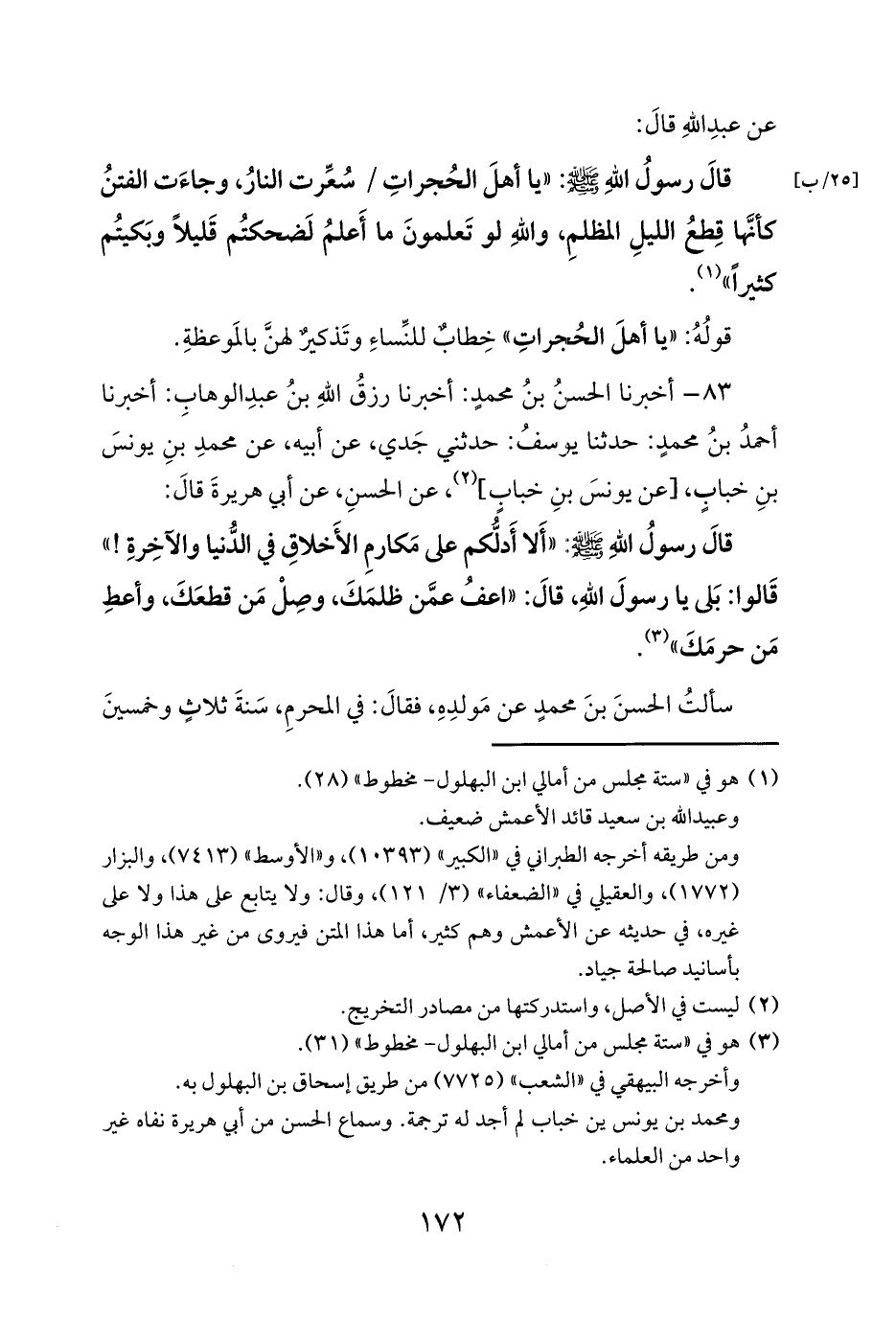 قالَ رسولُ اللهِ صلى الله عليه وسلم: «يا أهلَ الحُجراتِ / سُعِّرت النارُ، وجاءَت الفتنُ كأنَّها قِطعُ الليلِ المظلمِ، واللهِ لو تَعلمونَ ما أَعلمُ لَضحكتُم قَليلاً وبَكيتُم كثيراً» (¬1).