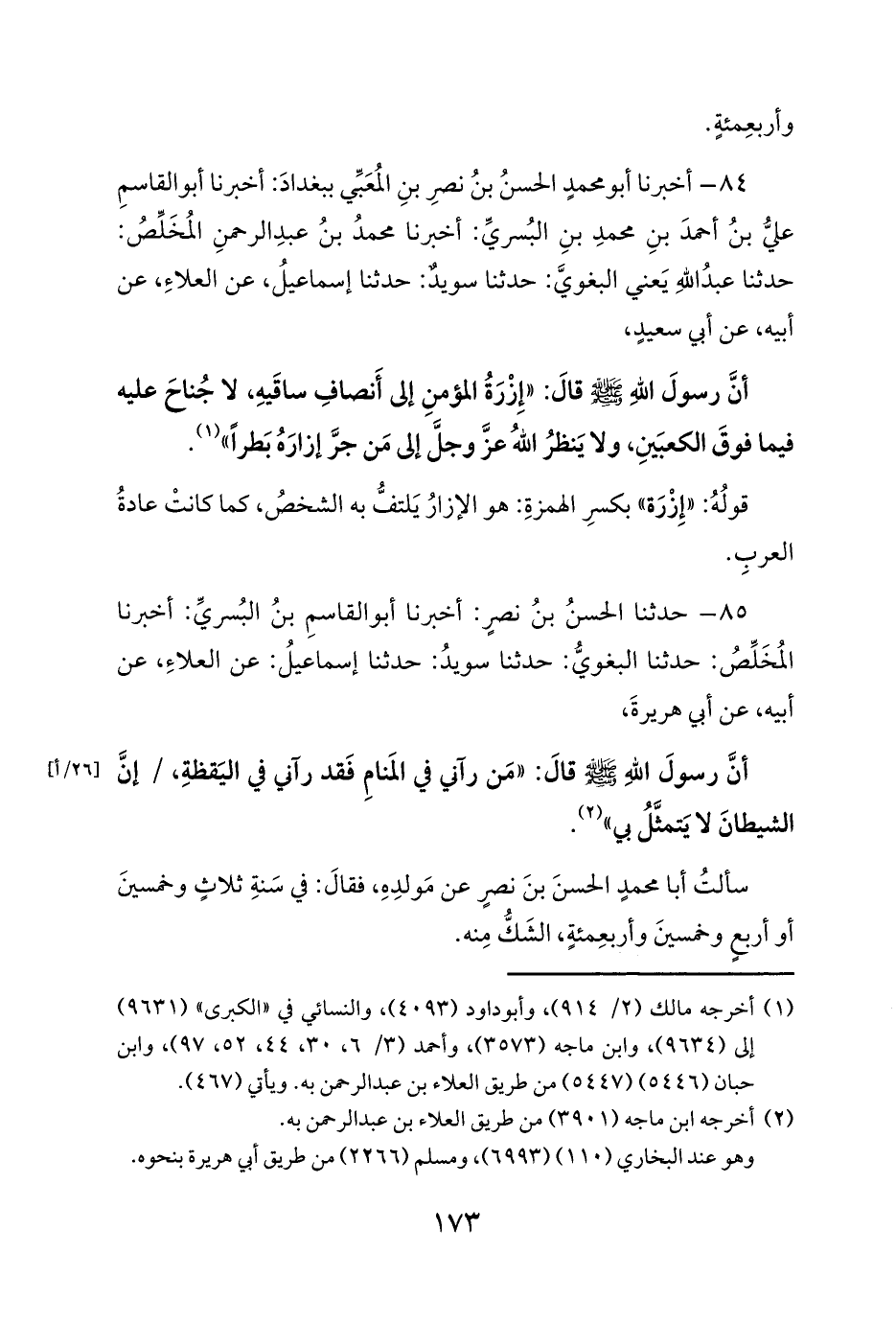84 - أخبرنا أبو محمدٍ الحسنُ بنُ نصرِ بنِ المُعَبِّي ببغدادَ: أخبرنا أبو القاسمِ عليُّ بنُ أحمدَ بنِ محمدِ بنِ البُسريِّ: أخبرنا محمدُ بنُ عبدِ الرحمنِ المُخَلِّصُ: حدثنا عبدُ اللهِ يَعني البغويَّ: حدثنا سويدٌ: حدثنا إسماعيلُ، عن العلاءِ، عن أبيه، عن أبي سعيدٍ،