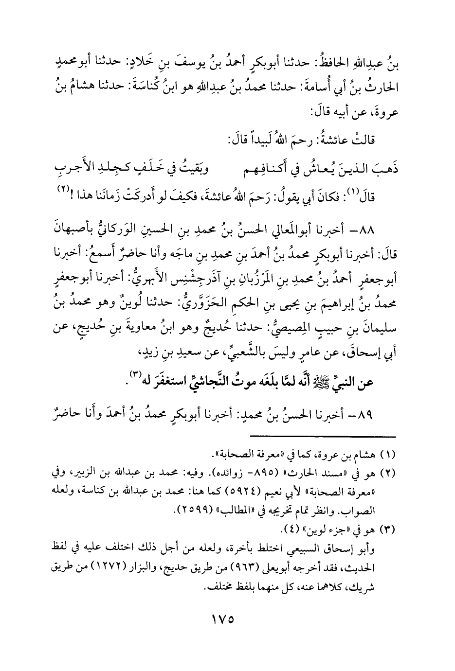 بنُ عبدِ اللهِ الحافظُ: حدثنا أبو بكرٍ أحمدُ بنُ يوسفَ بنِ خَلادٍ: حدثنا أبو محمدٍ الحارثُ بنُ أبي أُسامةَ: حدثنا محمدُ بنُ عبدِ اللهِ هو ابنُ كُناسَةَ: حدثنا هشامُ بنُ عروةَ، عن أبيه قالَ: