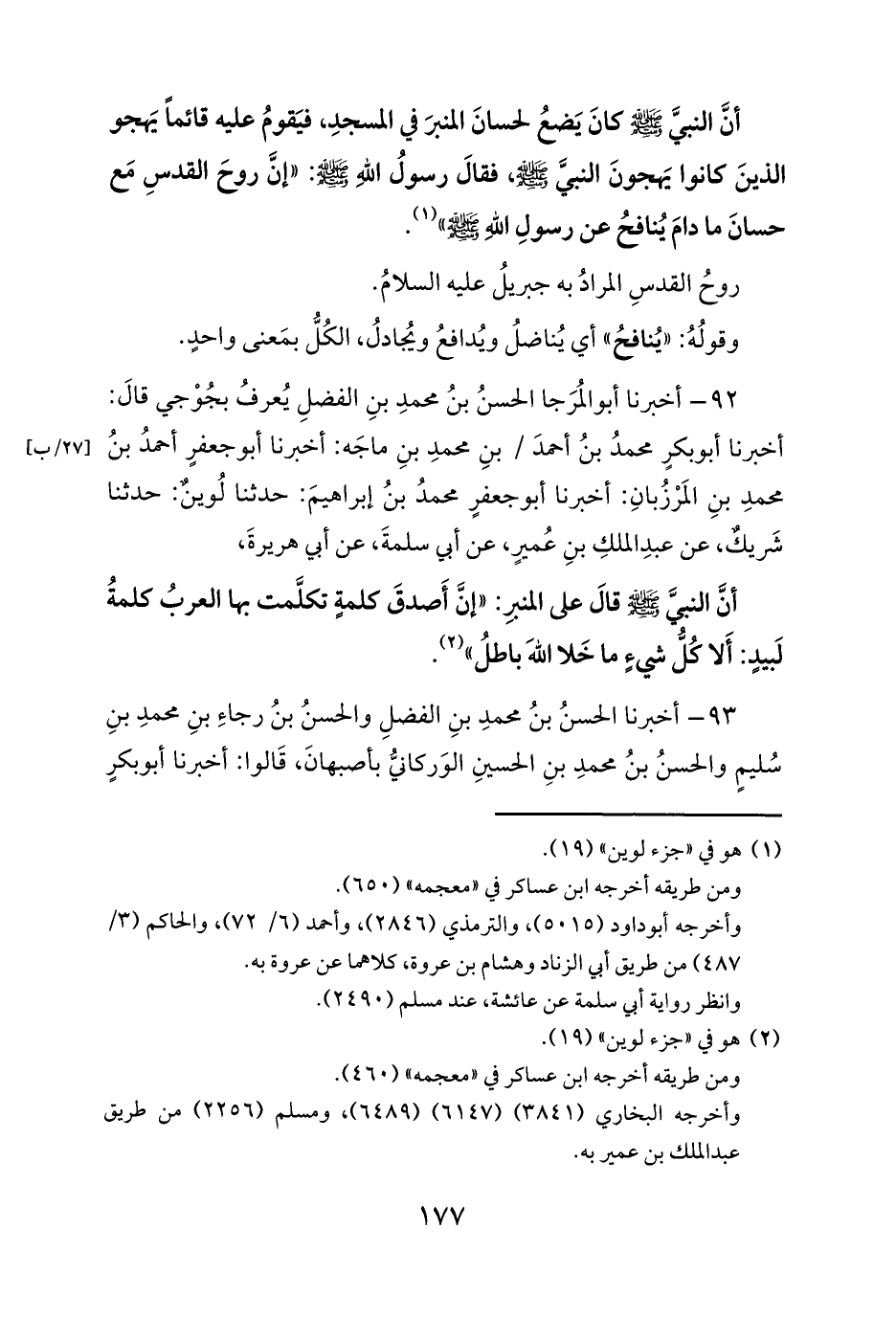 أنَّ النبيَّ صلى الله عليه وسلم كانَ يَضعُ لحسانَ المنبرَ في المسجدِ، فيَقومُ عليه قائماً يَهجو الذينَ كانوا يَهجونَ النبيَّ صلى الله عليه وسلم، فقالَ رسولُ اللهِ صلى الله عليه وسلم: «إنَّ روحَ القدسِ مَع حسانَ ما دامَ يُنافحُ عن رسولِ اللهِ صلى الله عليه وسلم» (¬1).